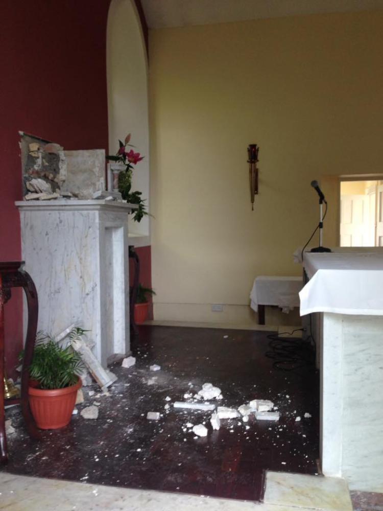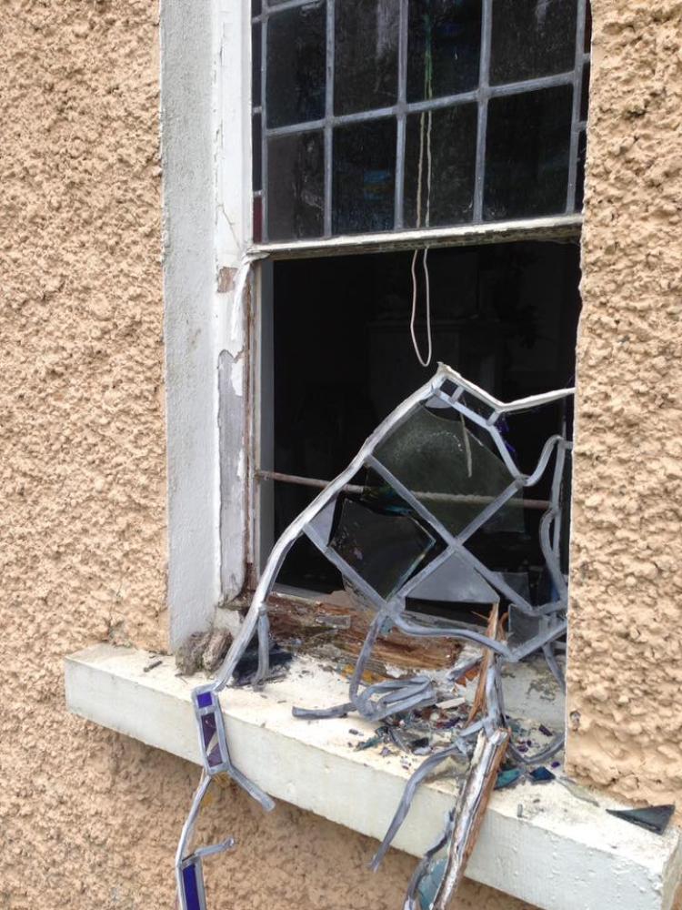 A tabernacle is a fixed, locked box in which the Eucharist is stored. Photographs taken at St Michael’s Church show the damage caused following the removal of the tabernacle and also shows a violently smashed window.