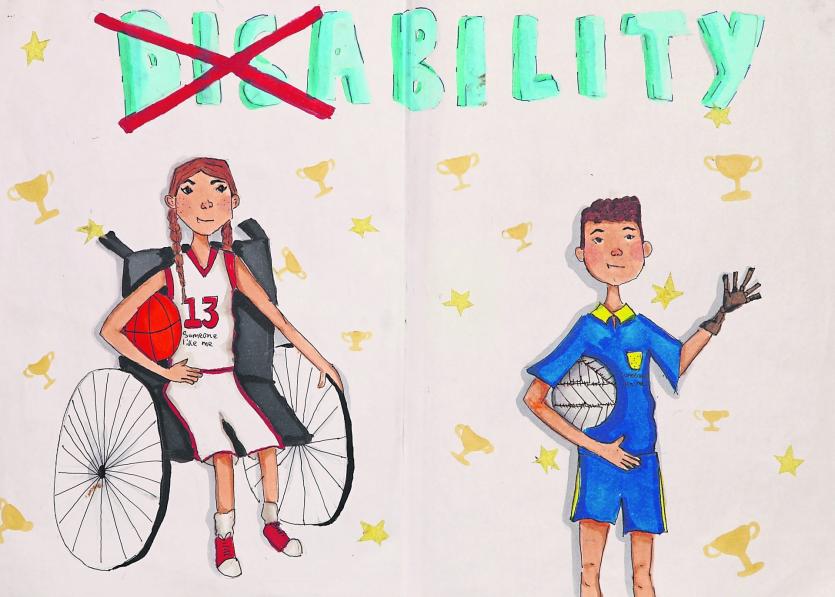5th class pupil at St Patrick’s NS, Eleanor O’Reilly, produced A3 poster of two disabled sports athletes; a wheelchair basketball player and a footballer with a prosthetic arm; titled disability but the 'dis' is crossed out to read 'ability'. Her teacher is Michelle McKeon.