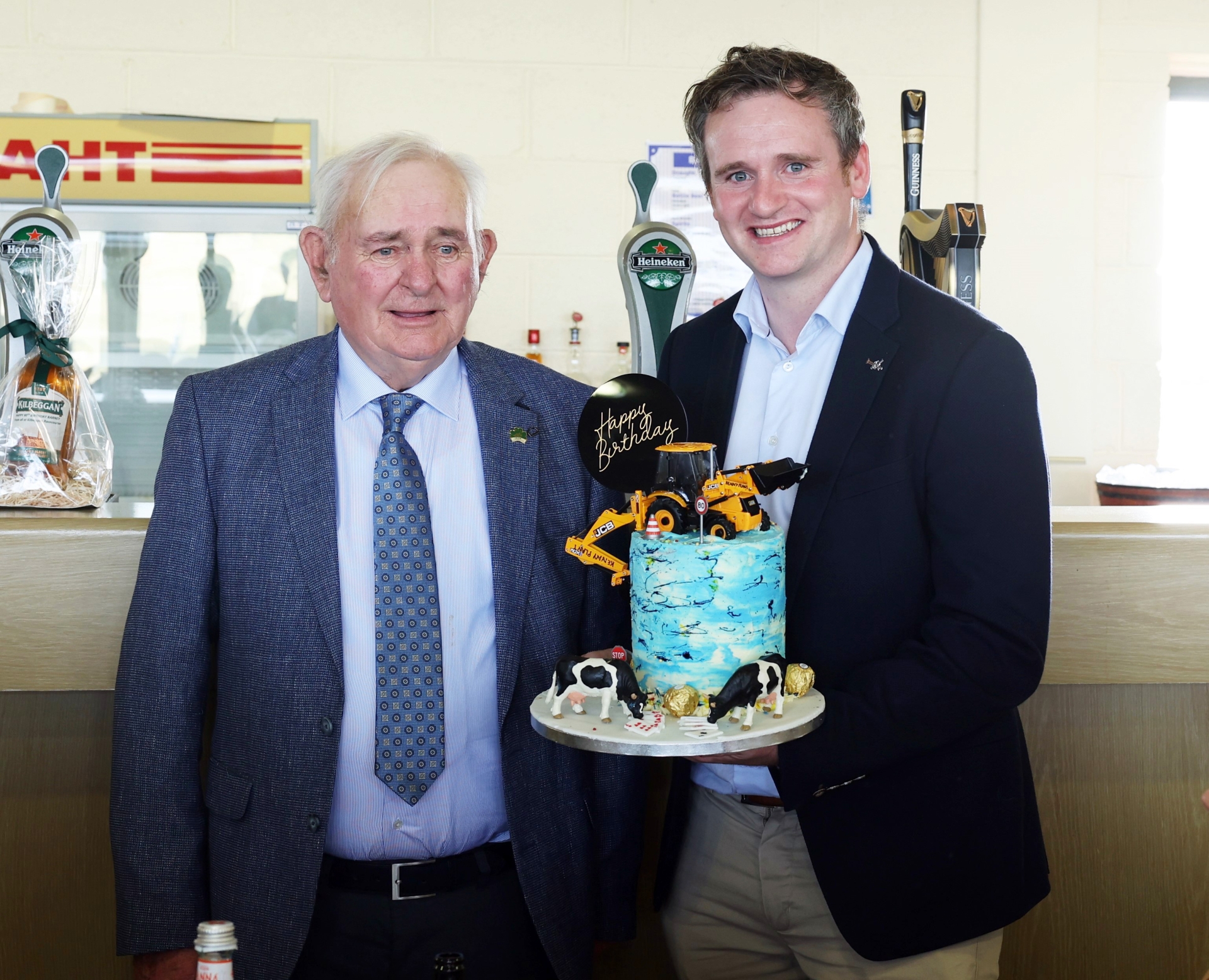 Caption: Barney's son James presents Barney with his 80th birthday cake with a replica of Barney's old JCB digger on top