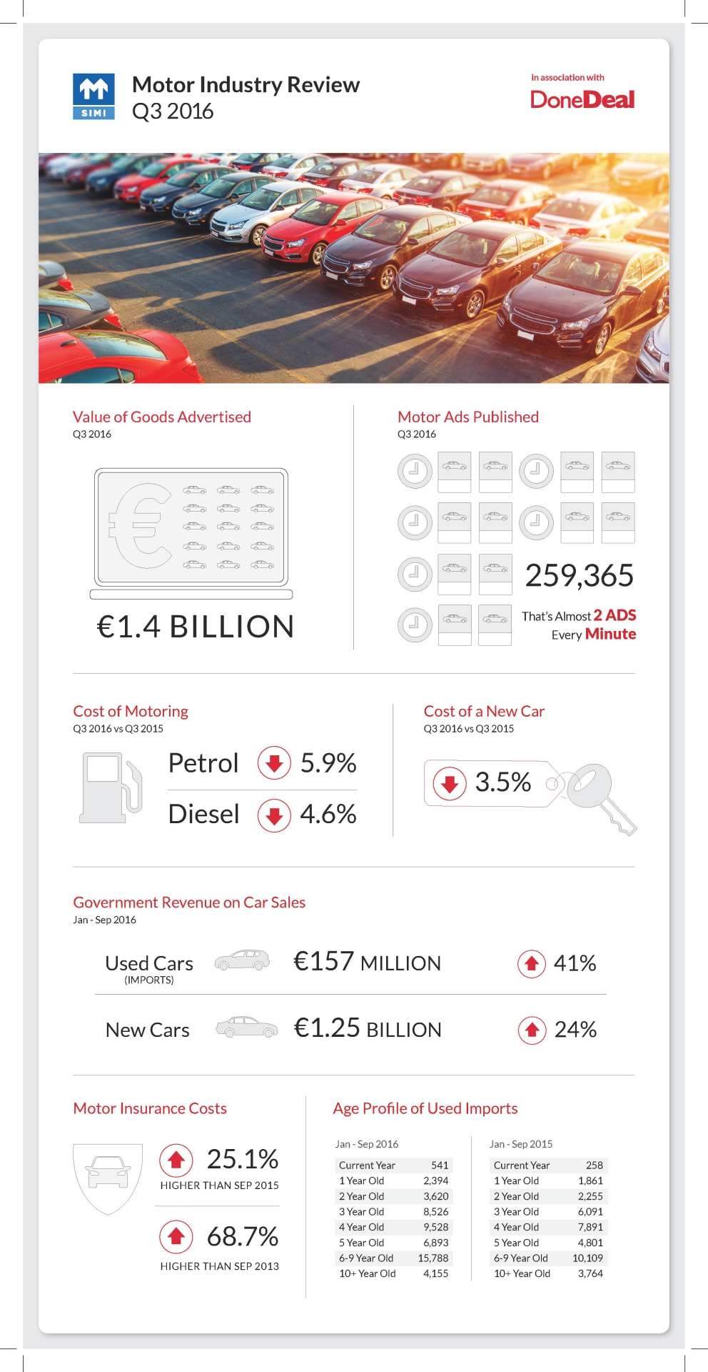 The Society of the Irish Motor Industry (SIMI) this week issued their third Quarterly Motor Industry Review for 2016 in association with DoneDeal, at the SIMI National Retailers Conference held in Killashee Hotel, Naas, Co Kildare. The SIMI/DoneDeal Report highlights the strong performance in the first half of the year for the Industry followed by a slowing down of new car sales from August onwards.