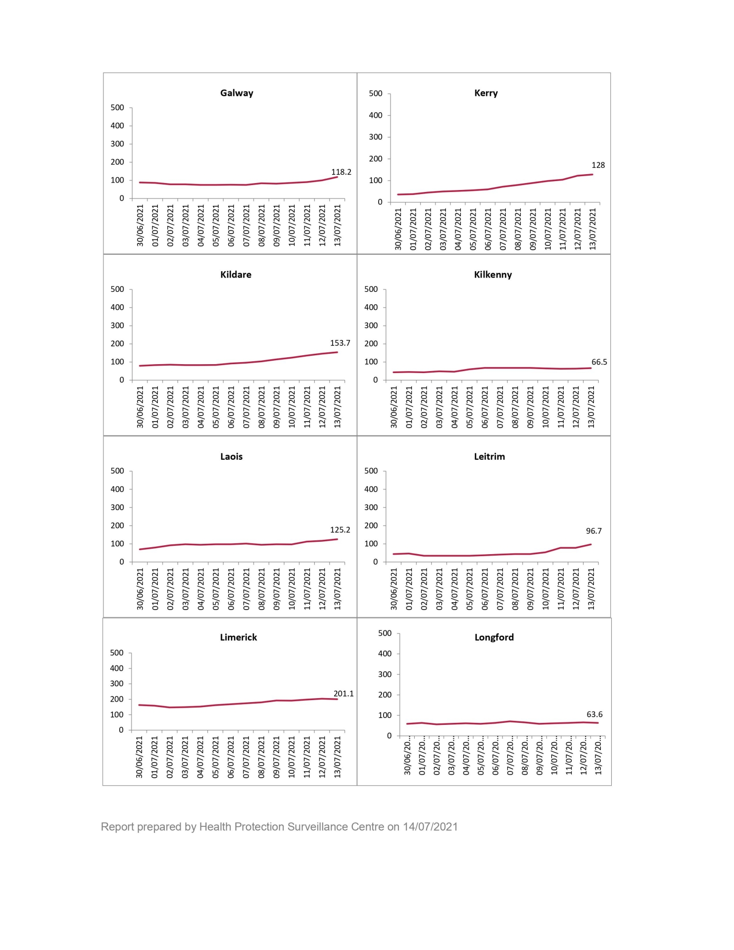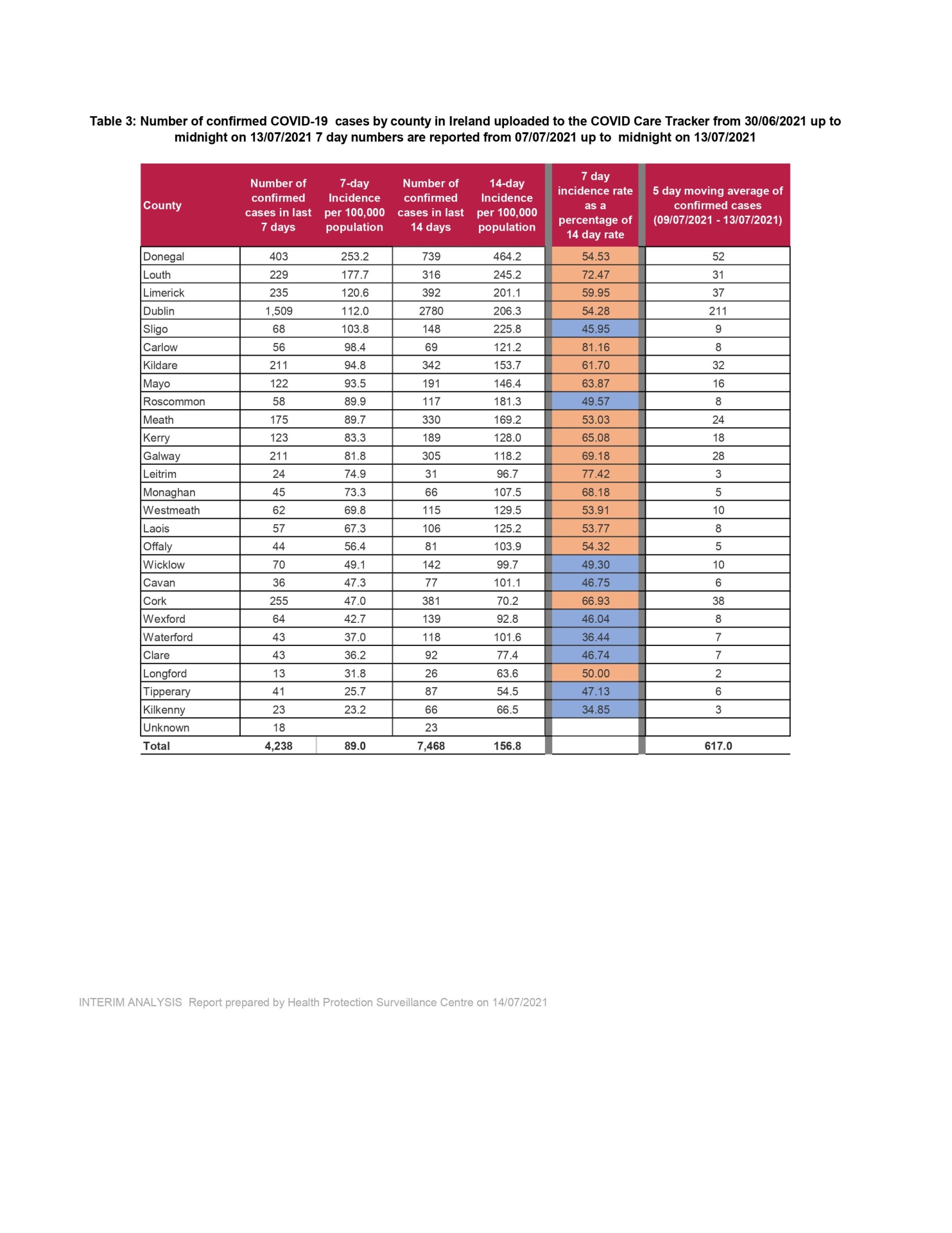 The fortnightly figures are from June 30 to July 13 with the seven day number from July 7 - 13 according to the latest report from the HPSC COVID Care Tracker.