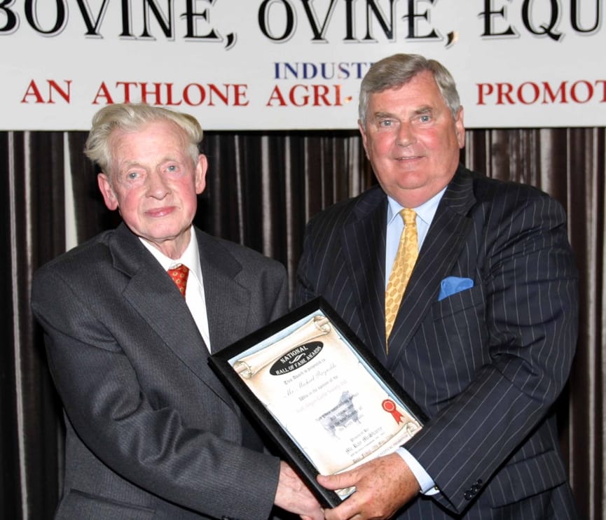 PHOTO: The late Michael Reynolds, Bohey, Drumlish, Co Leitrim (left) accepting the Irish Angus Cattle Society Hall of Fame Award in 2006 Picture: Facebook Irish Angus Cattle Society