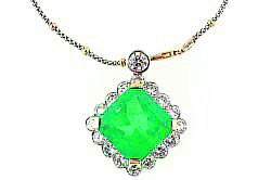 Lot 968 is an exquisite 18 ct. yellow and white gold natural Colombian emerald and round brilliant cut diamond pendant. The emerald weight is in excess of 26 ct. and the diamond weight exceeds 3.5 ct. The pendant is 42 cm. in length and the emerald measures an approximate 2 x 2 cm. Estimate: €50,000 – 70,000.