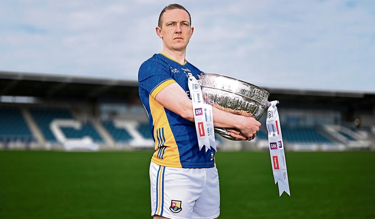 Longford captain Patrick Fox with the Delaney Cup during the 2025 Leinster SFC launch at Cedral St Conleth' Park in Newbridge on Monday Photo: Piaras Ó Mídheach/Sportsfile