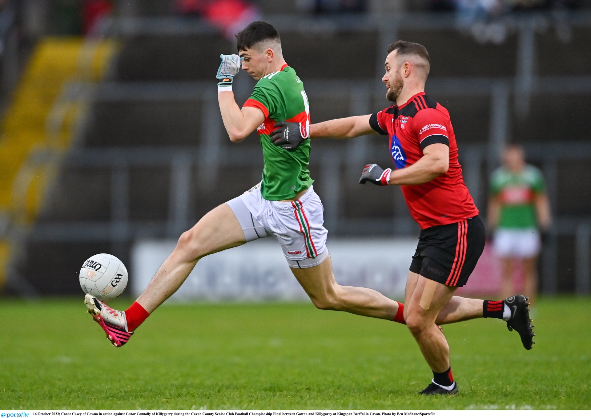 Caption: Conor Casey of Gowna in action against Conor Connolly of Killygarry during the Cavan County Senior Club Football Championship Final between Gowna and Killygarry at Kingspan Breffni in Cavan. Photo by Ben McShane/Sportsfile