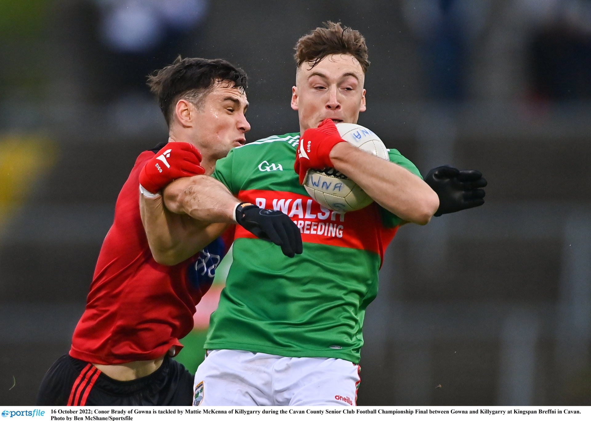 Caption: Conor Brady of Gowna is tackled by Mattie McKenna of Killygarry during the Cavan County Senior Club Football Championship Final between Gowna and Killygarry at Kingspan Breffni in Cavan. Photo by Ben McShane/Sportsfile