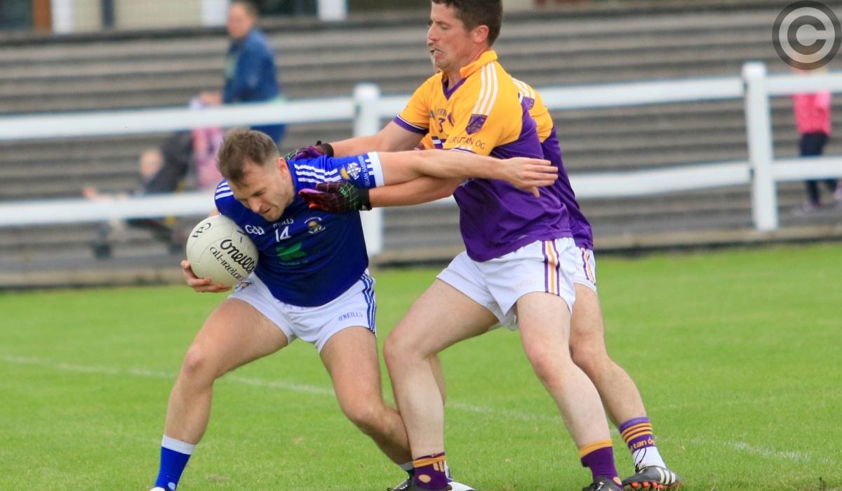 Shane Cox on the attack for Legan Sarsfields in this tussle with Young Grattans defender Damian McHugh. Action from the Intermediate Football Championship first round game last weekend. Pic: Syl Healy
