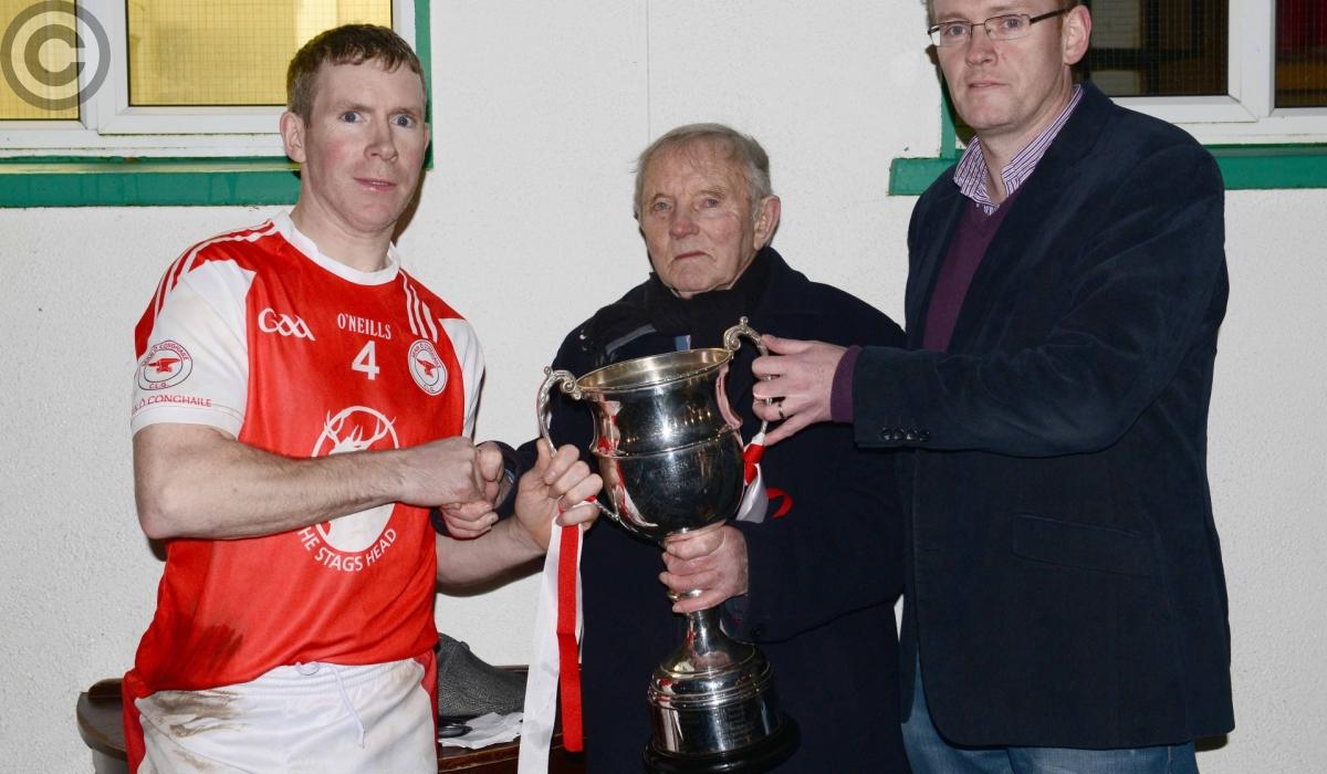 Jimmy Reilly presenting the Patsy Reilly Cup, assisted by County Board Central Council delegate and Connolly's clubman Michael Carrigy. to Sean Connolly's captain Andy McNamee. Photo: Declan Gilmore