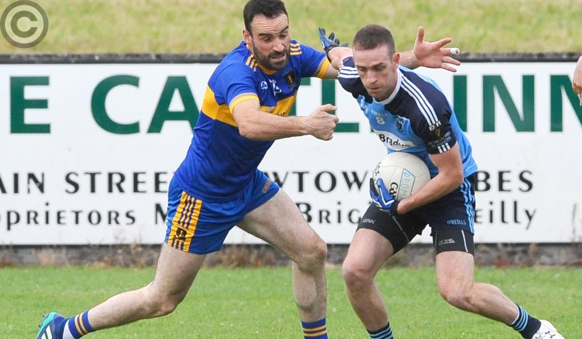 Andrew Dalton on the ball for Longford Slashers in this tussle with Dromard opponent Diarmuid Masterson. Action from the SFC Group 3 clash at Allen Park on Sunday evening. Photo: Declan Gilmore