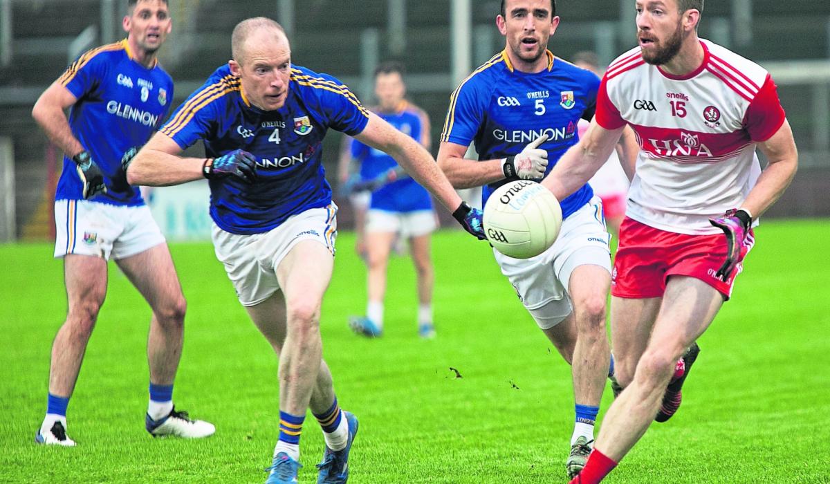 Niall Loughlin on the attack for Derry in evading the challenge of Longford defender Barry O'Farrell. Action from the 2020 National Football League Division 3 game at Celtic Park back in October