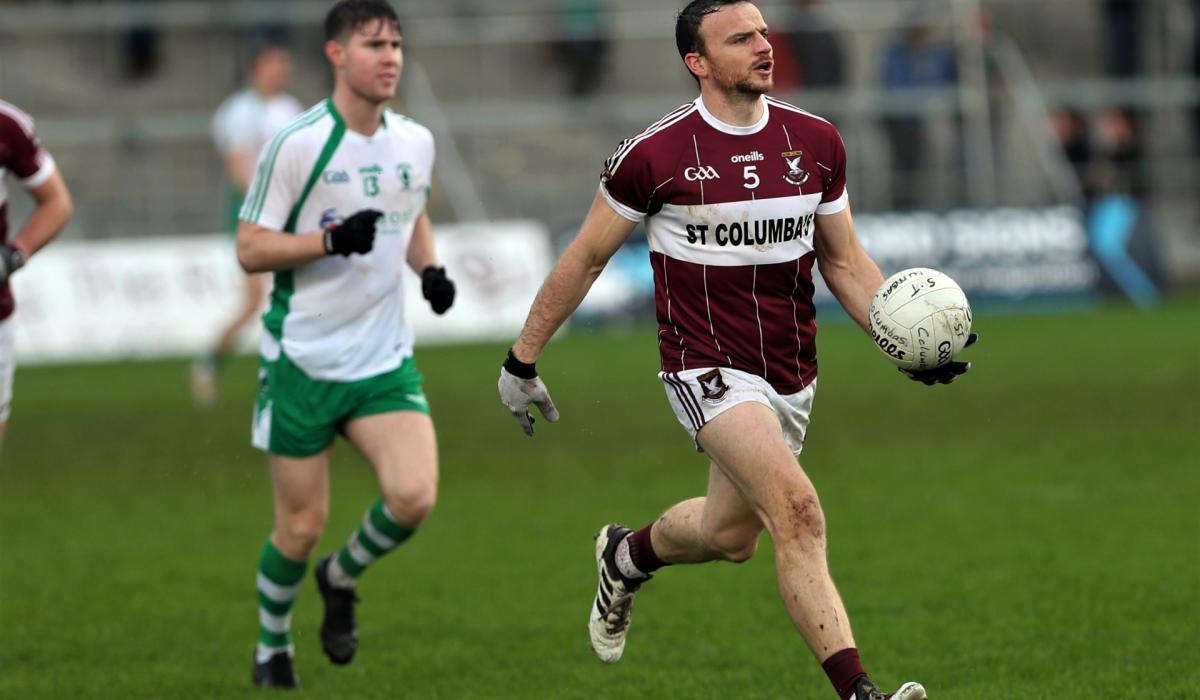 Played in difficult conditions at a wet and windy Glennon Brothers Pearse Park on Sunday evening, St Columba’s were in front throughout the match but just a solitary point separated the sides (0-7 to 0-6) when Mark Hughes converted a free for Emmet Og in the 47th minute.