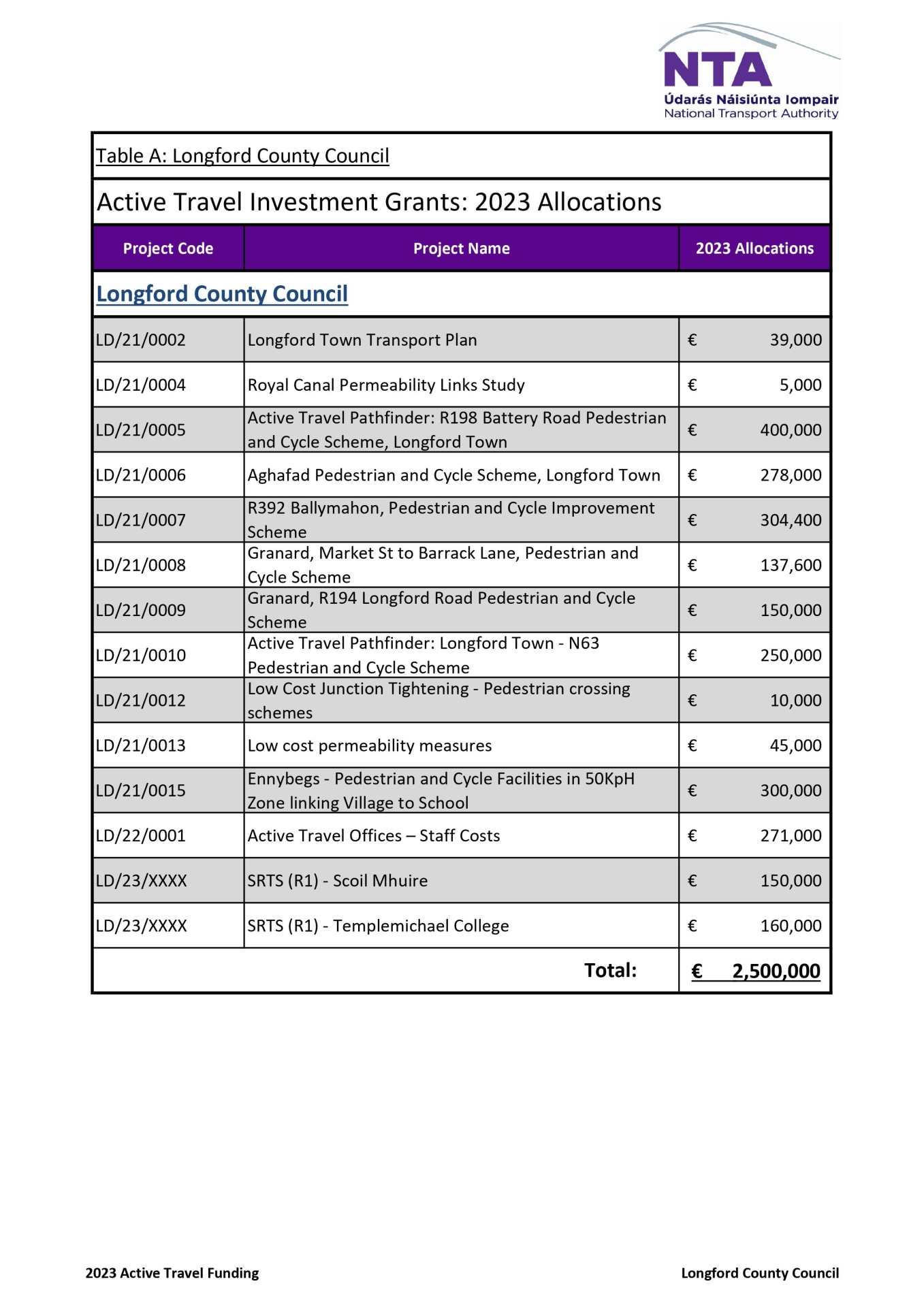 Longford has received €2.5m under the 2023 fund allocation for Active Travel walking and cycling infrastructure projects.