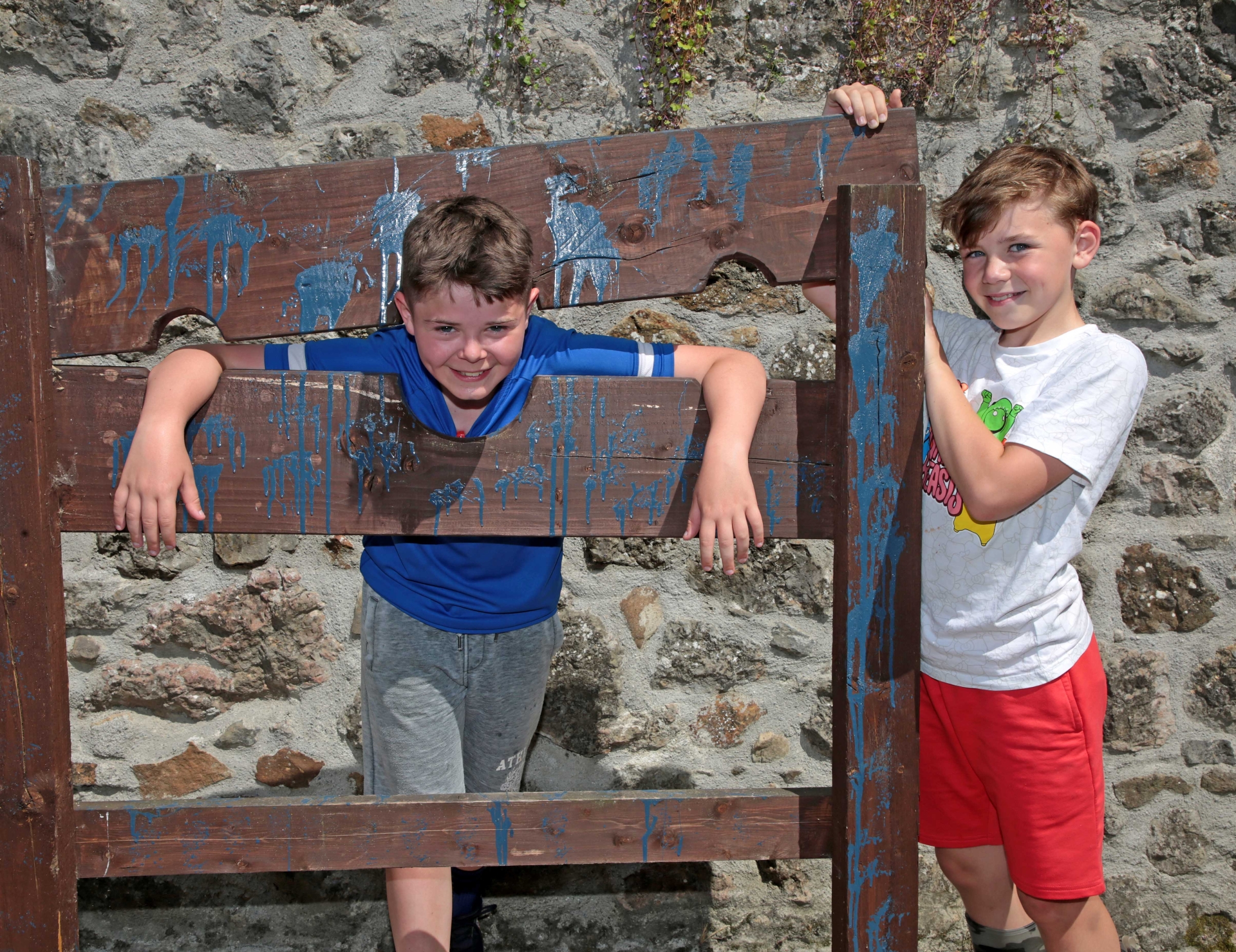 Caption: Tiernan Farrell and Mack O'Neill in Skelly's Courtyard, Ballymahon on Saturday for the Goldsmith Live event featuring music, stalls and Goldsmith 'The Glory Years'