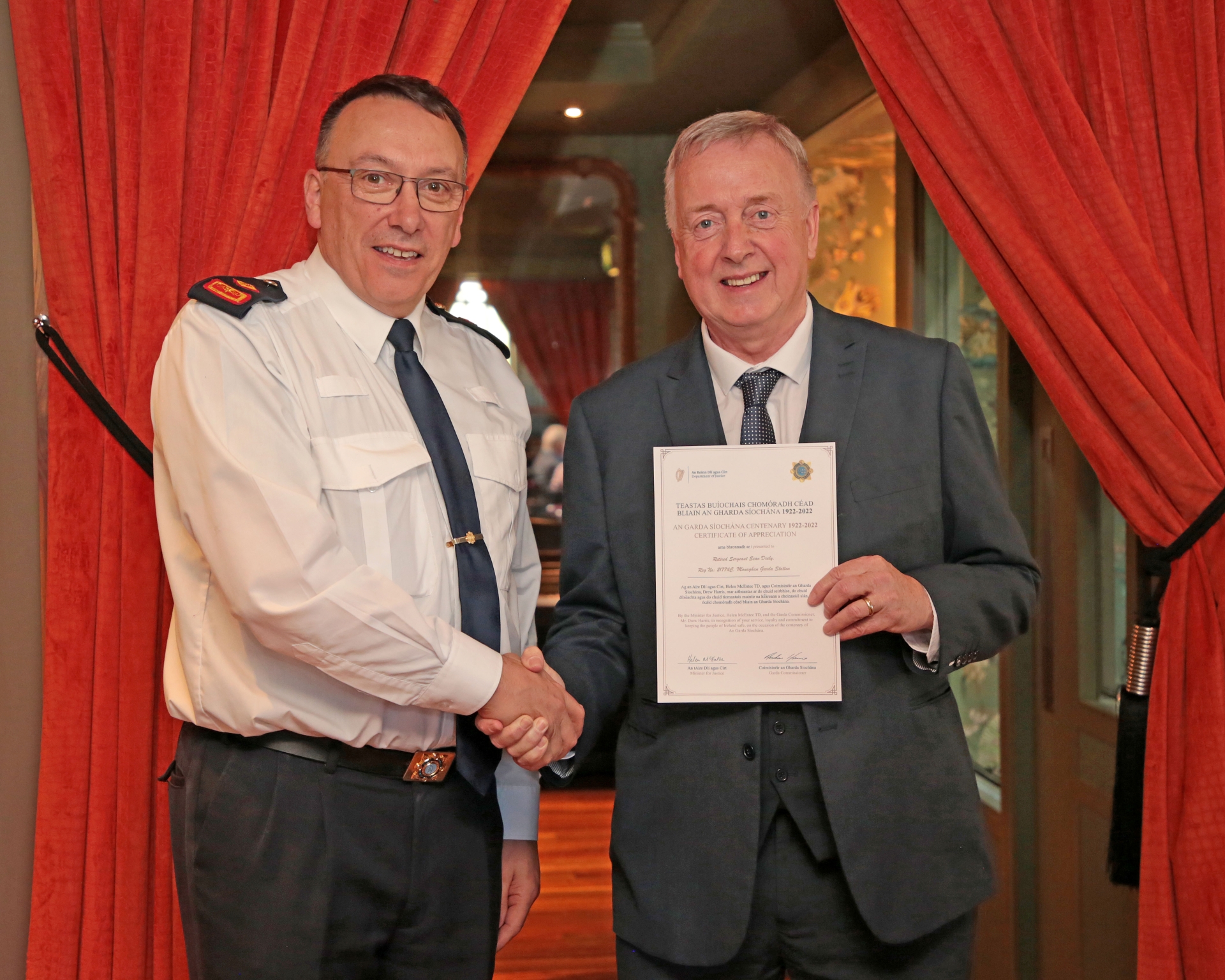 Caption: Superintendent Seamus Boyle presenting a certificate to Sean Deely, who joined An Garda Siochana on December 5, 1979 and retired on December 22, 2015 Picture: Shelley Corcoran