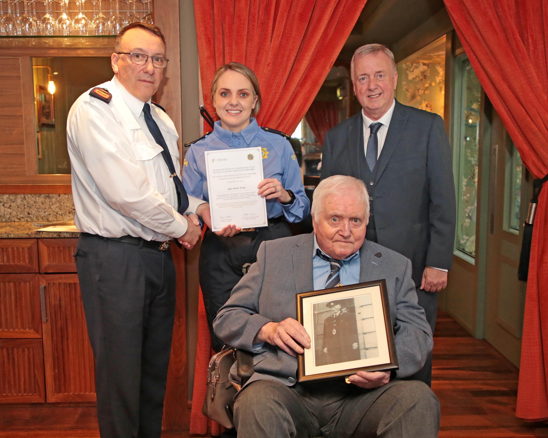 Caption: On April 13, 2023 the Deely family celebrated 100 years of continuous service in An Garda Siochana. Pictured are Christopher Deely, who joined An Garda Siochana on November 11, 1953 and retired on June 6, 1994, his son Sean (standing on right), who joined An Garda Siochana on December 5, 1979 and retired on December 22, 2015 and Sean's daughter Aileen, who joined An Garda Siochana on November 23, 2015 and is stationed at Mountjoy Garda Station, accepting a certificate from Superintendent Seamus Boyle. Christopher is holding a photo of his father William in uniform taken at Store Street Garda Station Dublin, when he was serving there Picture: Shelley Corcoran