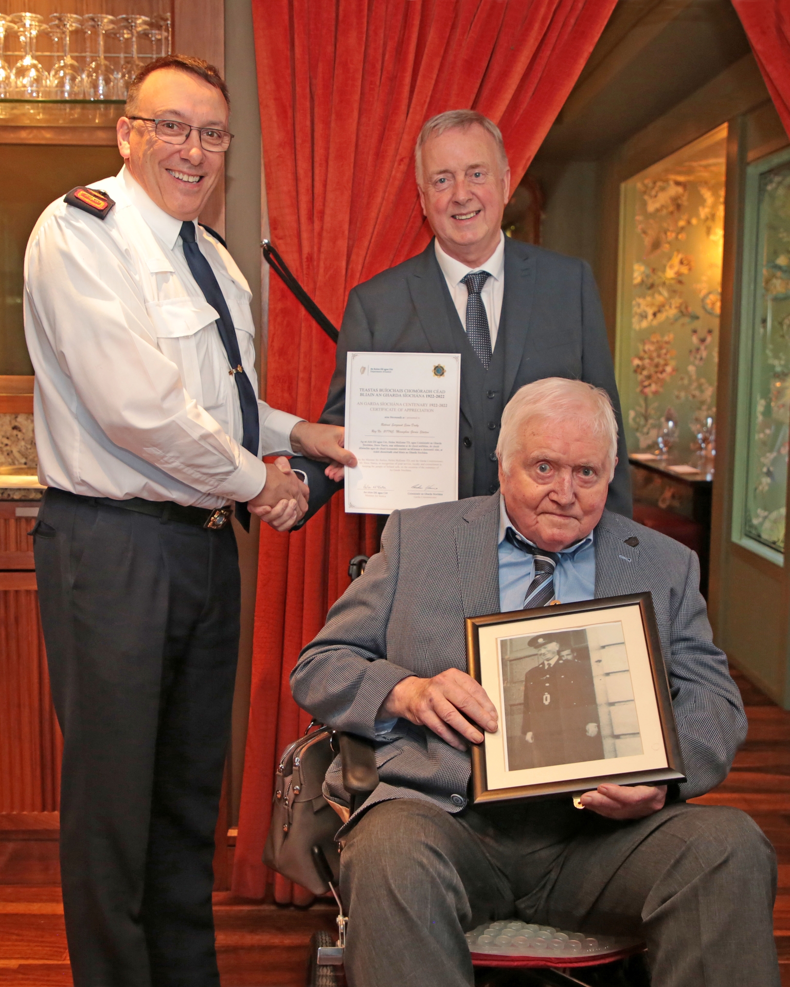 Caption: Superintendent Seamus Boyle presenting a certificate to Sean Deely, who joined An Garda Siochana on December 5, 1979 and retired on December 22, 2015. Also in the photo is Sean's father, Christopher Deely, who joined An Garda Siochana on November 11, 1953 and retired on June 6, 1994. Christopher is holding a photo of his father William in uniform taken at Store Street Garda Station Dublin Picture: Shelley Corcoran