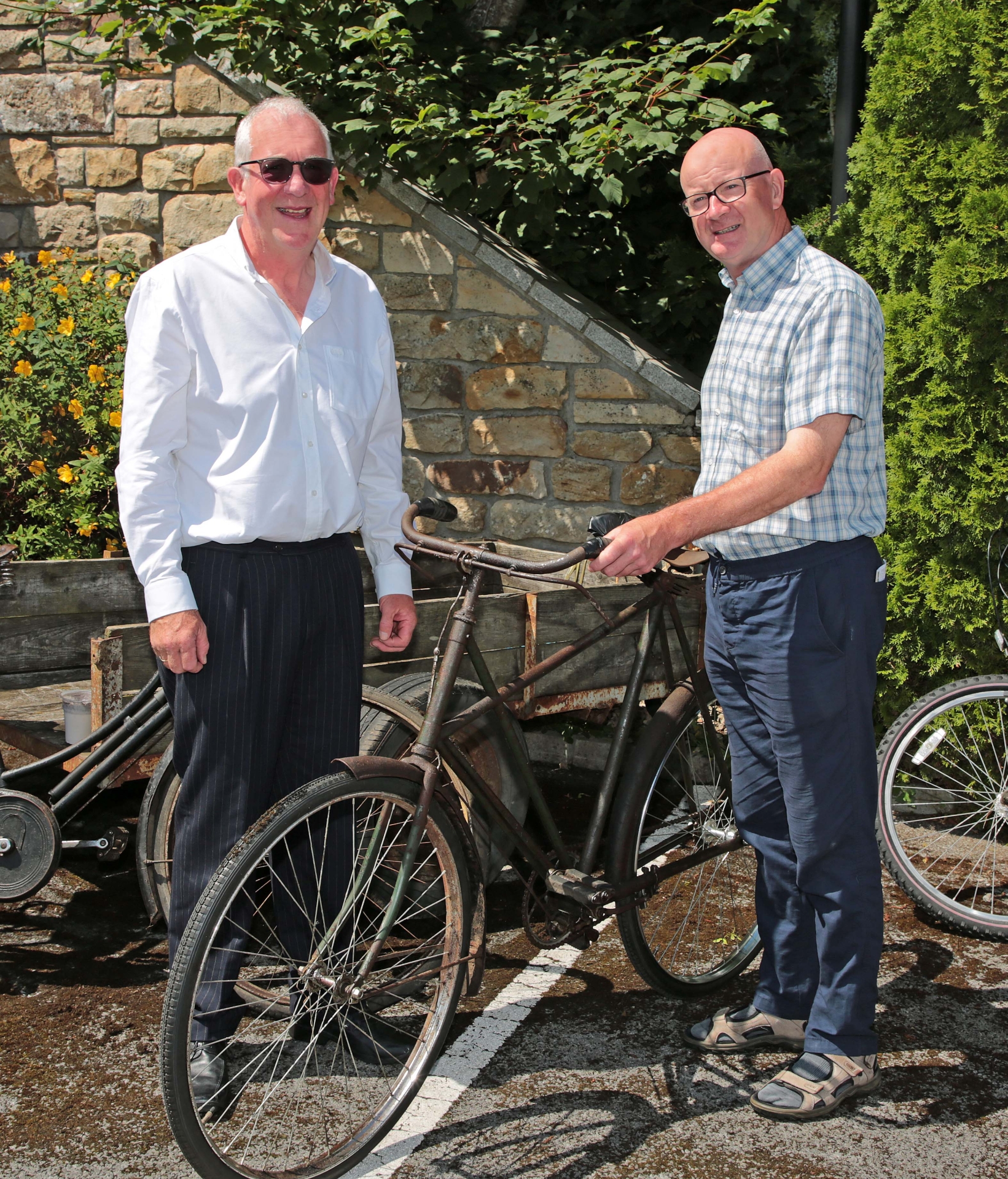 Caption: Cathal Sorohan and John Maleady with a 101 year old Elswick Bike which was bought for 6 pounds in Hanlons in 1922