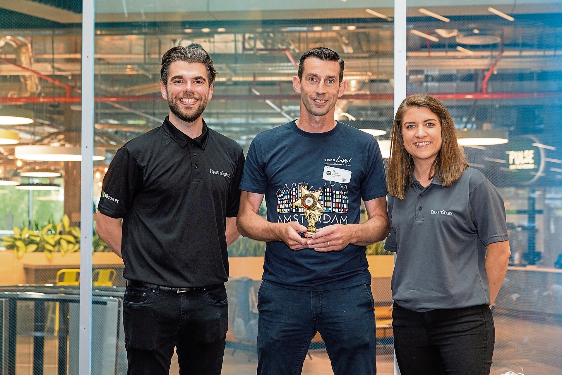 ichael Barrett and Amanda Jolliffe from the Microsoft Dream Space Showcase are pictured presenting the OurKidsCode Most Collaborative Project award to Colmcille BCP, Longford for their STEM-based project, 'Le