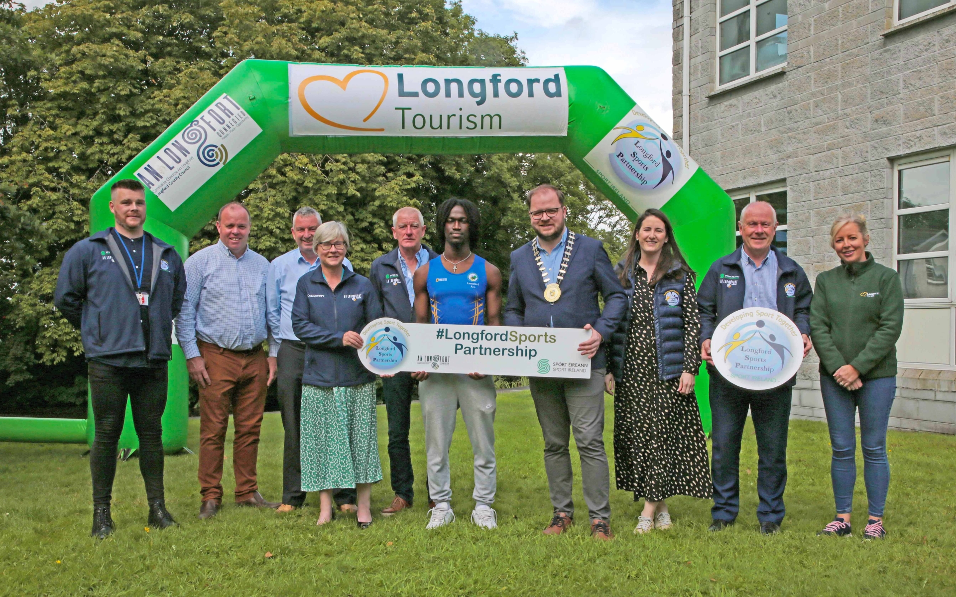 CAPTION: Michael Reilly (Longford Sports Partnership), Cllr Paraic Brady, Longford County Council Director of Services Michael Nevin, Longford County Council Director of Services Barbara Heslin, Tony Headon (Chairperson Longford Sports Partnership), Caleb Gilbert Longford Athletics Club, Longford County Council Cathaoirleach Colm Murray, Longford Sports Partnership Coordinator Sarah Mulligan, Longford County Council Chief Executive Paddy Mahon and Tara Cunningham Longford Tourism Picture: Shelley Corcoran