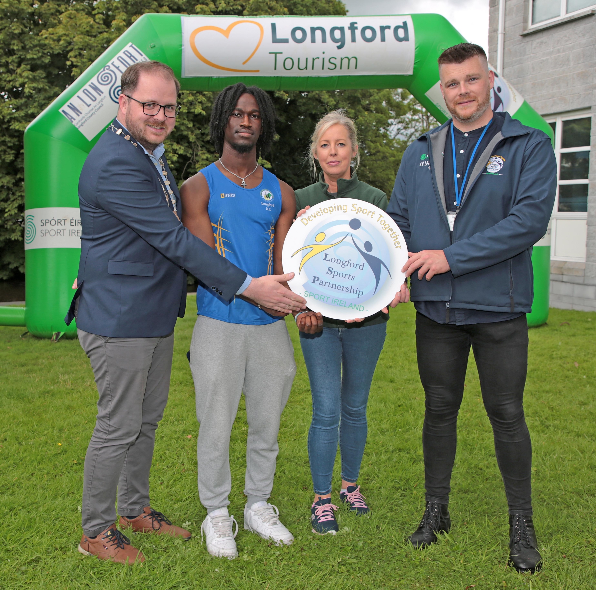 Caption: Longford County Council Cathaoirleach Colm Murray, Caleb Gilbert Longford Athletics Club, Tara Cunningham Longford Tourism and Michael Reilly Longford Sports Partnership Picture: Shelley Corcoran