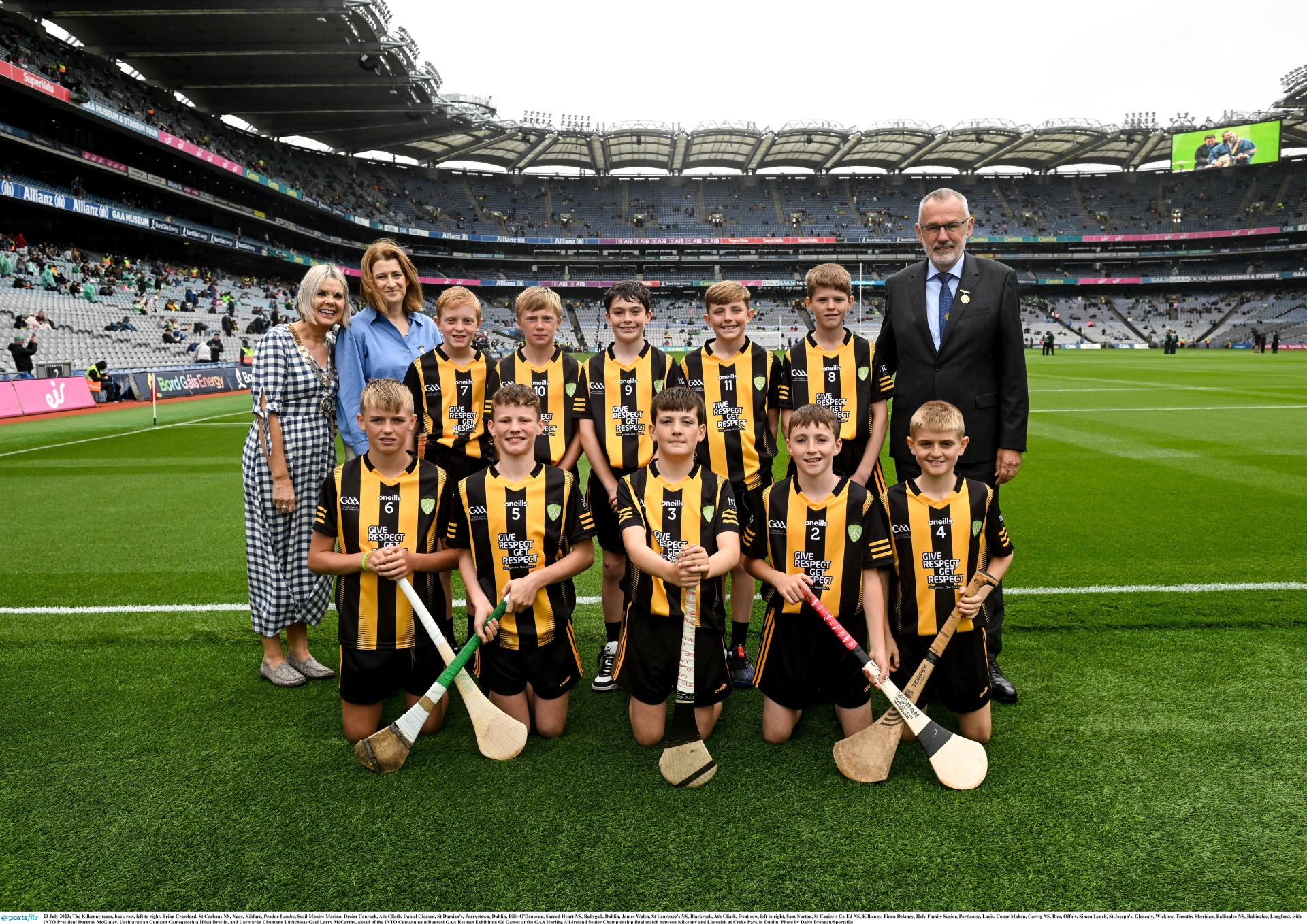 CAPTION: The Kilkenny team, back row, left to right, Brian Crawford, St Corbans NS, Naas, Kildare, Peadar Lambe, Scoil Mhuire Marino, Droim Conrach, Ath Cliath, Daniel Gleeson, St Damian's, Perrystown, Dublin, Billy O'Donovan, Sacred Heart NS, Ballygall, Dublin, James Walsh, St Laurence's NS, Blackrock, Ath Cliath, front row, left to right, Sam Norton, St Canice's Co-Ed NS, Kilkenny, Fionn Delaney, Holy Family Senior, Portlaoise, Laois, Conor Mahon, Carrig NS, Birr, Offaly, Simon Lynch, St Joseph's, Glenealy, Wicklow and Timothy Sheridan, Ballinalee NS, Ballinalee, Longford, with INTO President Dorothy McGinley, Uachtarán an Cumann Camógaíochta Hilda Breslin, and Uachtarán Chumann Lúthchleas Gael Larry McCarthy, ahead of the INTO Cumann na mBunscol GAA Respect Exhibition Go Games at the GAA Hurling All-Ireland Senior Championship final between Kilkenny and Limerick at Croke Park on Sunday, July 23. Picture: Daire Brennan/Sportsfile