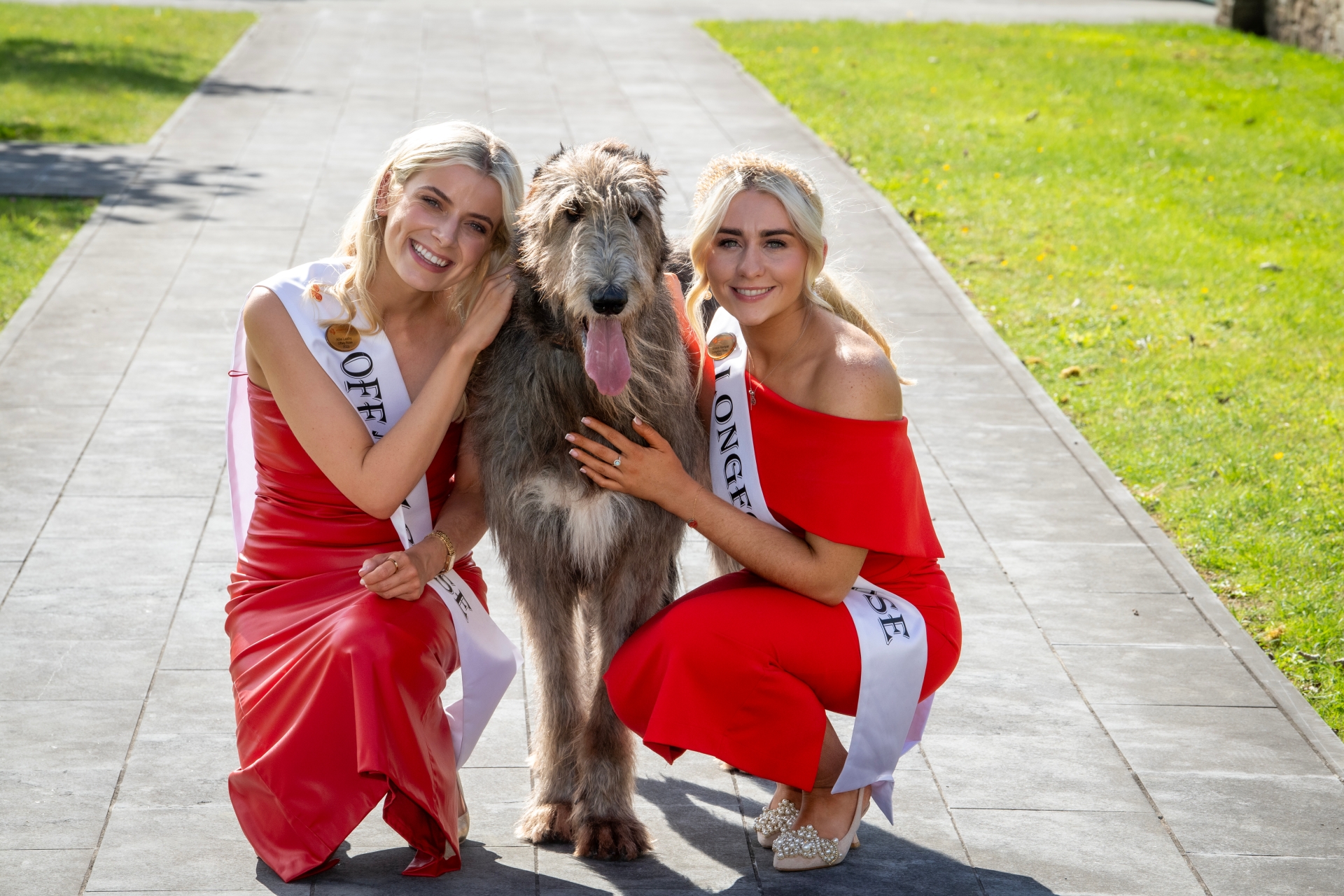 Caption: Offaly Rose Allie Leahy and Longford Rose Grace Kemple pictured with Boann the Irish Wolfhound at Tullamore Dew Distillery in Co. Offaly as part of the Rose Tour Picture: Domnick Walsh
