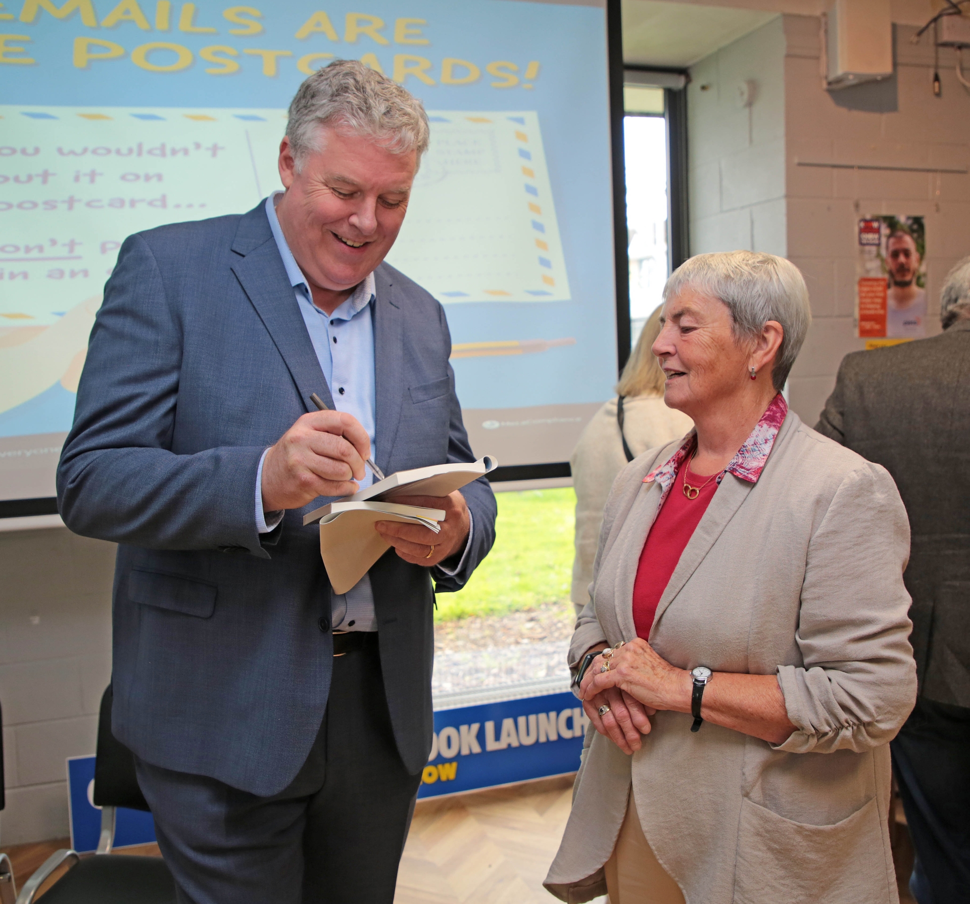 Caption: Ciaran Mullooly signing a copy of his new book for Jean Duncan in Longford library Picture: Shelley Corcoran