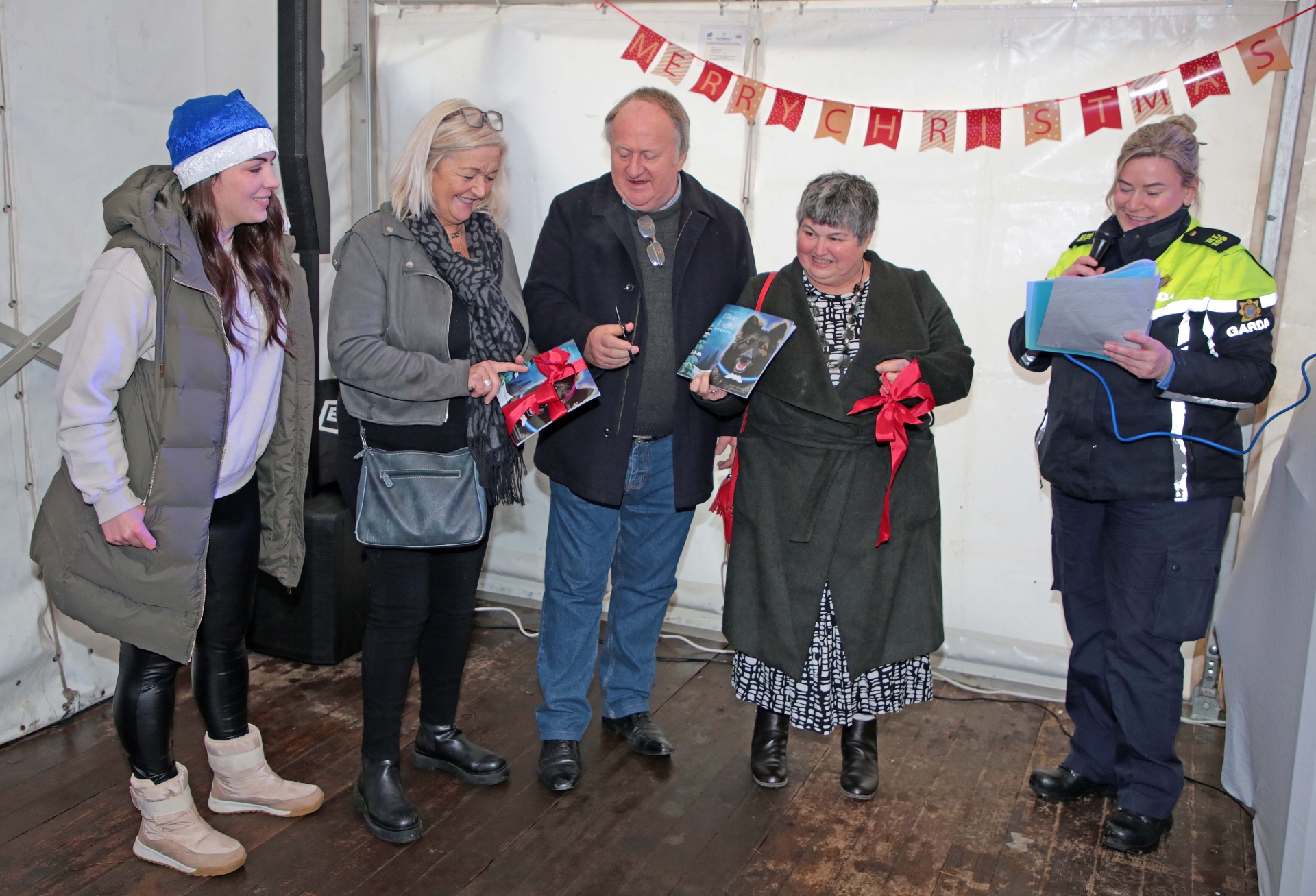 Caption: At Jolly Boys Christmas Market in Ballymahon for the launch of the 2023 Operation Blue Light Santa campaign book entitled Operation Blue Light Heroes were author Jessica Thompson, Cathy Birmingham (mother of the late Max Wenman who features in the book), Dave and Olive Kelly (parents of the late Luke McCormack who also features in the book) and Garda Emma Kiernan, founder of the fundraising campaign, Operation Blue Light Santa coverage Picture: Shelley Corcoran