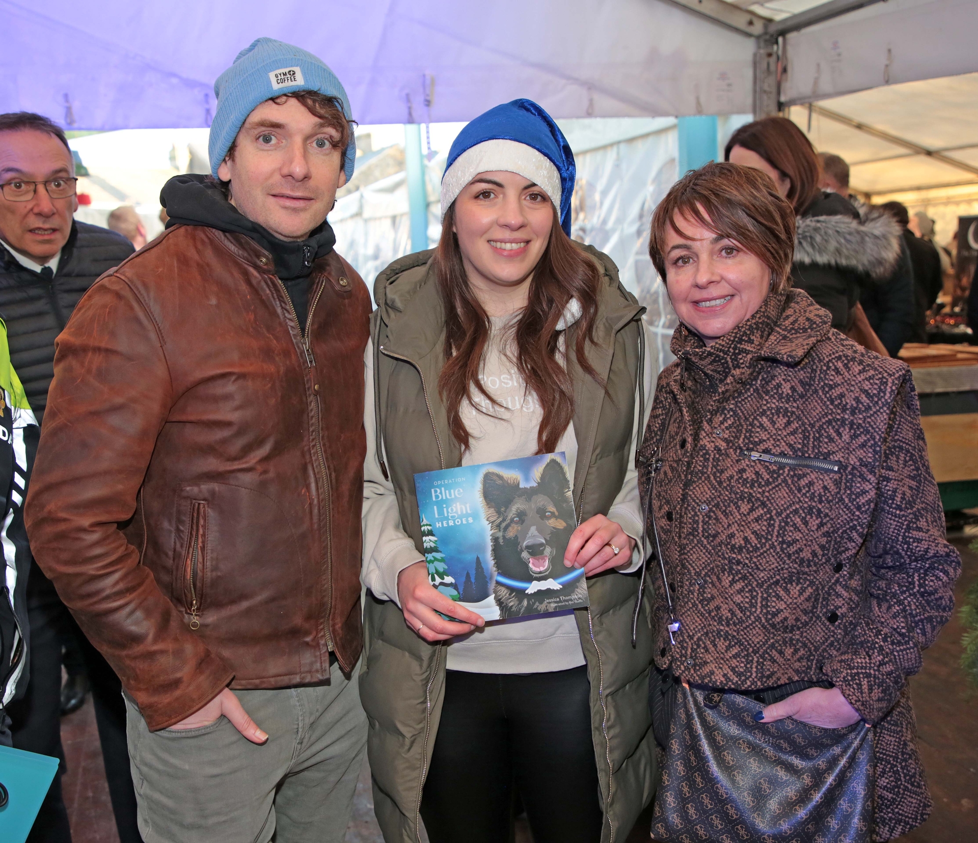 Caption: At Jolly Boys Christmas Market in Ballymahon last Saturday, December 2 for the launch of the 2023 Operation Blue Light Santa book, Operation Blue Light Heroes were author Jessica Thompson (centre) with John Mulry and Laura Thompson Picture: Shelley Corcoran