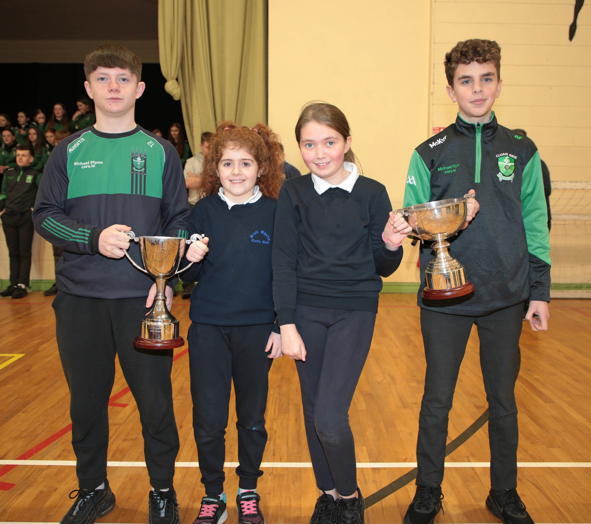 Caption: Clonguish GAA, ladies football and Cumann na mBunscol teams achieved extraordinary success during 2023 and on Monday, December 18 much of the silverware that was annexed was put on display in the PJ Murphy Sportshall, Newtownforbes for the pupils of the local Scoil Mhuire, Newtownforbes to admire and catch a glimpse of. Pictured are Evan Lyons, Khloe McGlynn, Eden Hoban and Rory Flynn Picture: Shelley Corcoran