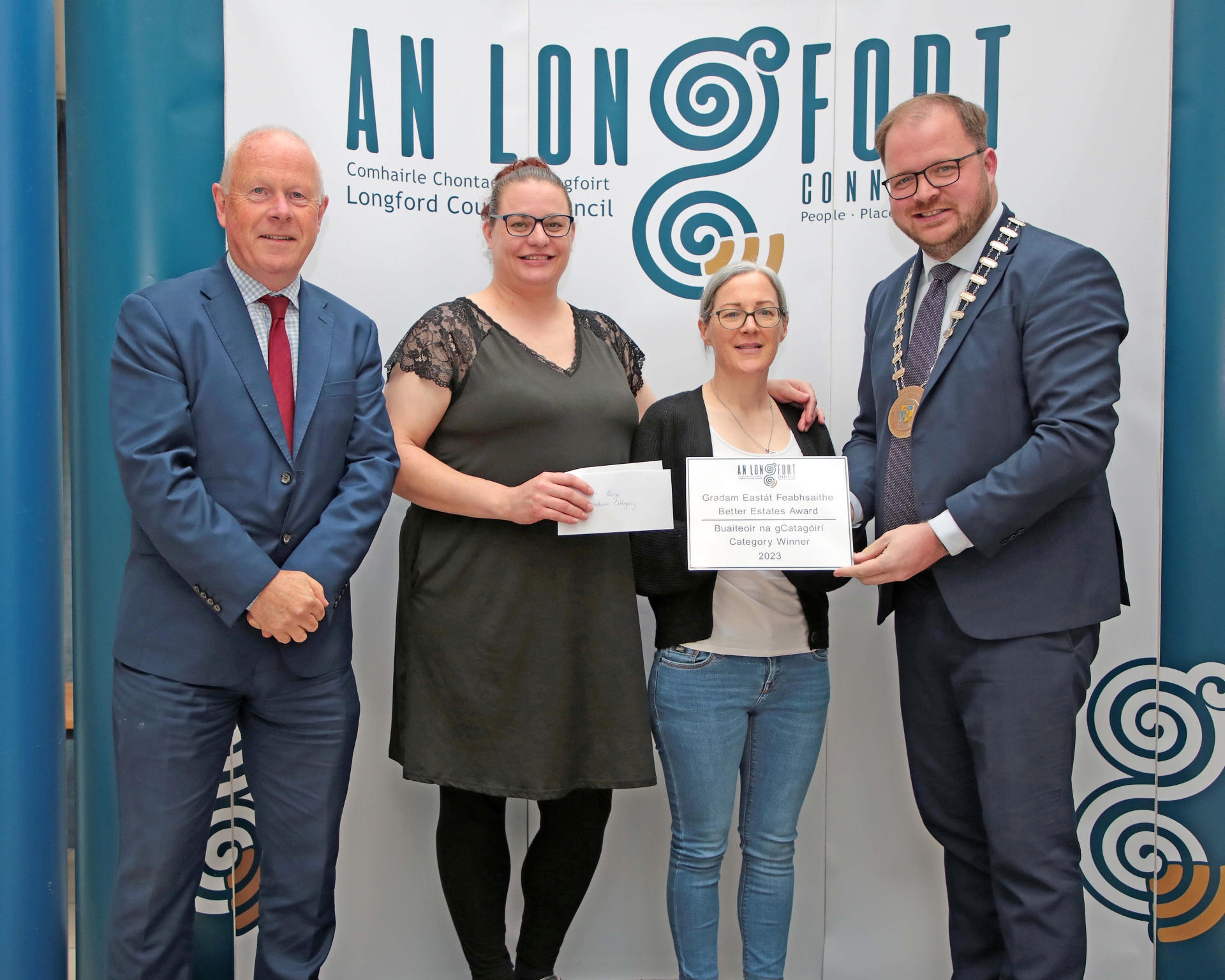 Caption: Campbell's Drive, Longford was first place in the Medium Category at the 2023 Better Estate Awards and pictured are Longford County Council Chief Executive Paddy Mahon, Radomira Simkova, Eileen McGuire and Longford County Council Cathaoirlleach Colm Murray Picture: Shelley Corcoran