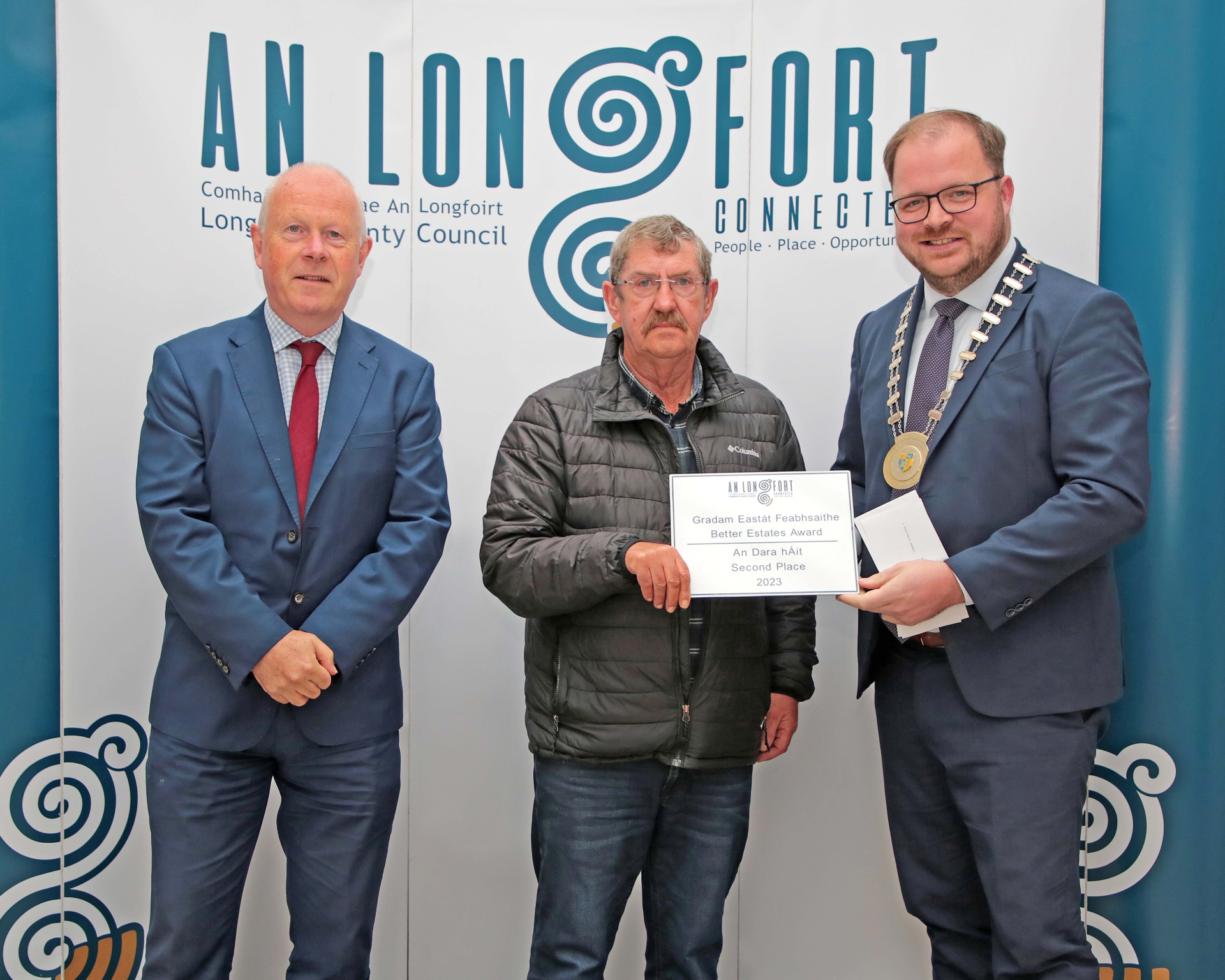 Caption: Church View Drive, Lanesboro finished second in the Medium Category at the Better Estate Awards 2023 and pictured are Longford County Council Chief Executive Paddy Mahon, Gerry Linnane and Longford County Council Cathaoirleach Colm Murray Picture: Shelley Corcoran