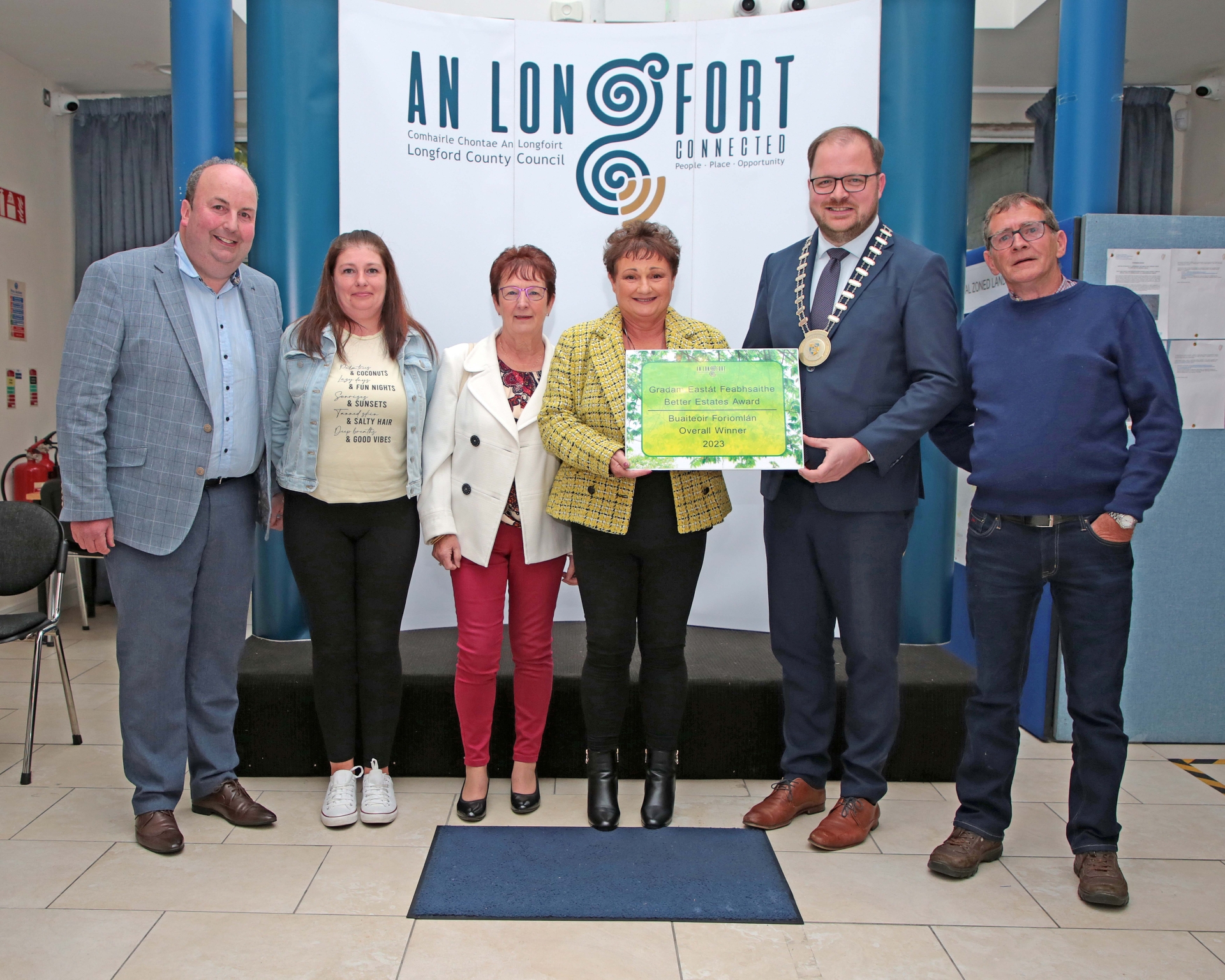 Caption: River Crescent, Ballinalee was the Overall 2023 Better Estates Award winner and picture shows Sarah Murtagh accepting the award from Longford County Council Cathaoirleach Colm Murray. On the left is Cllr Colin Dalton Picture: Shelley Corcoran