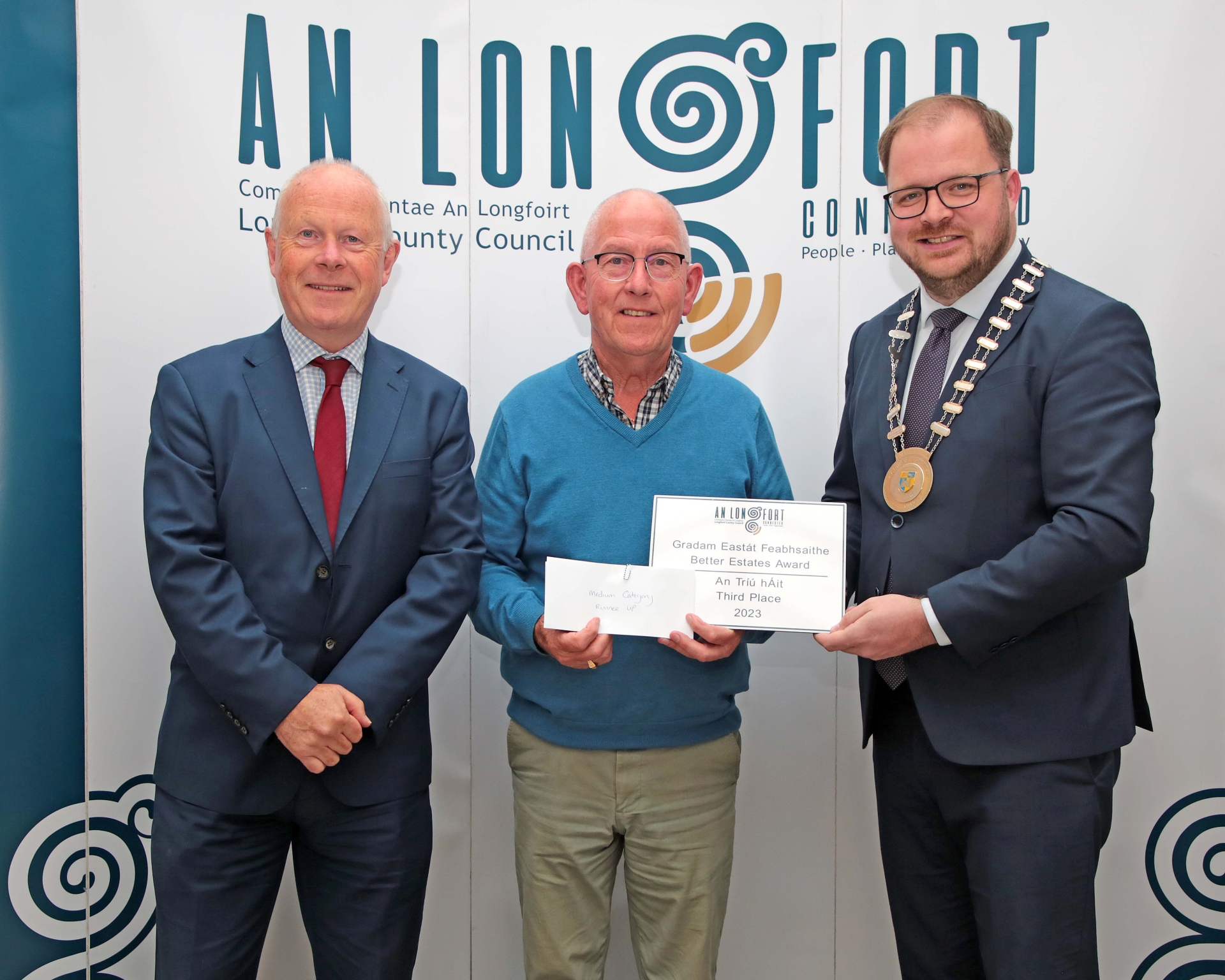 Caption: St Patrick's Ballinamuck: was third in the Medium Category at the 2023 Better Estate Awards and pictured are Longford County Council Chief Executive Paddy Mahon, Patsy Brady and Longford County Council Cathaoirleach Colm Murray Picture: Shelley Corcoran