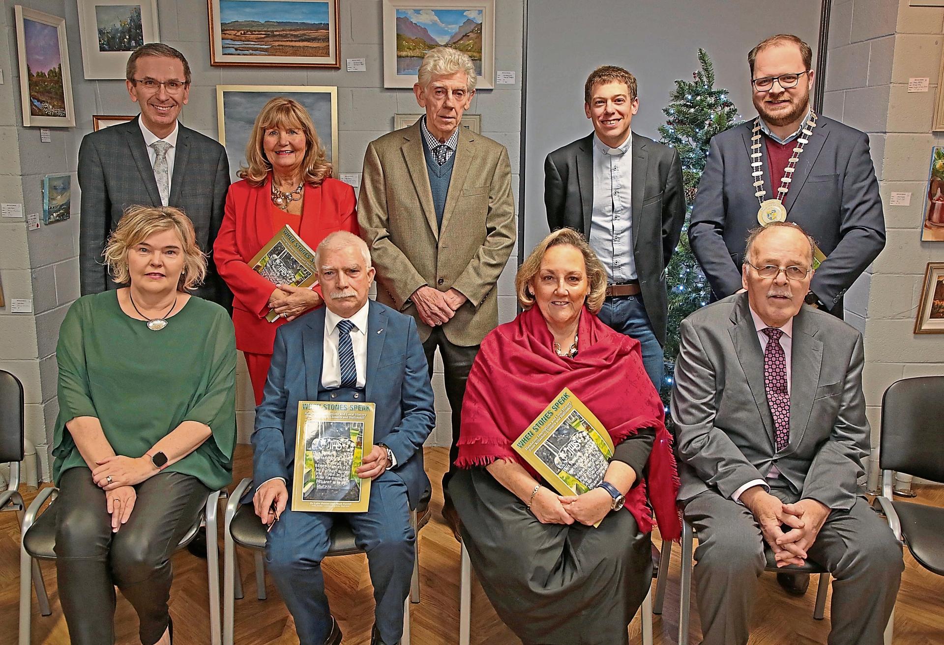 Longford County Archivist Martin Morris, former County Librarian Mary Carleton Reynolds, Mike Mulvihill, Fr Simon Cadam, Rev. Simon Scott, Longford County Council Cathaoirleach Colm Murray, Jennifer Edgeworth, Hugh Farrell (co author), Cllr Peggy Nolan and Luke Baxter (co author) at the launch of ‘When Stones Speak’ in Longford Library on Tuesday, December 12 PICTURES: SHELLEY CORCORAN