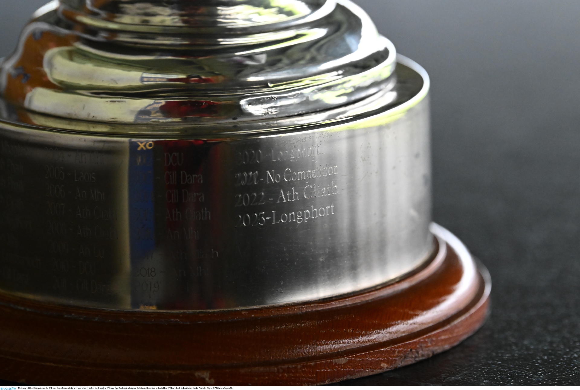 Caption: Engraving on the O'Byrne Cup of some of the previous winners before the Dioralyte O'Byrne Cup final match between Dublin and Longford at Laois Hire O'Moore Park in Portlaoise, Laois. Photo by Piaras Ó Mídheach/Sportsfile