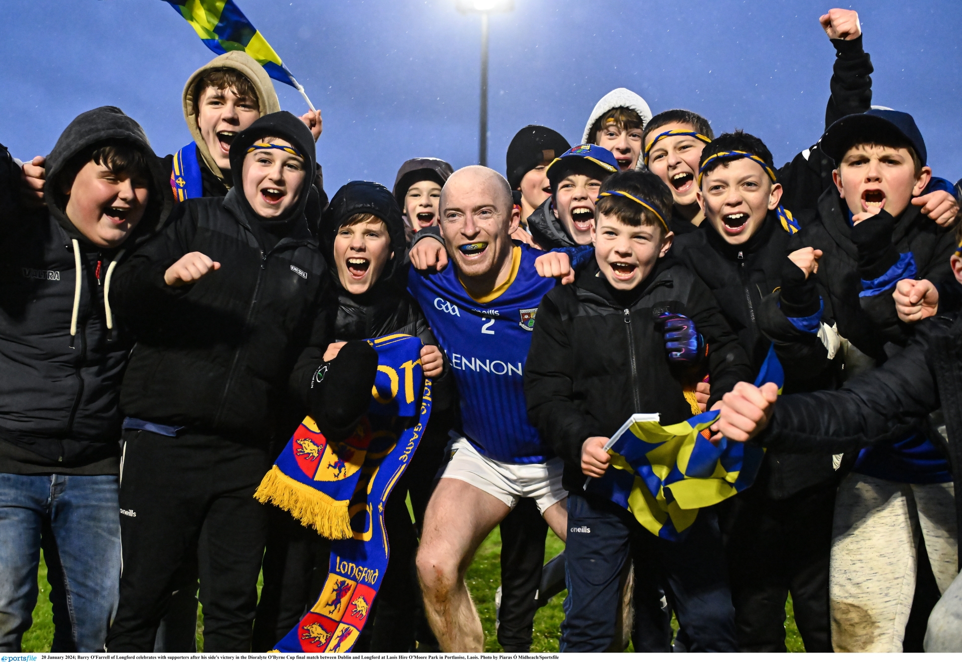 Caption: Barry O'Farrell of Longford celebrates with supporters after his side's victory in the Dioralyte O'Byrne Cup final match between Dublin and Longford at Laois Hire O'Moore Park in Portlaoise, Laois. Photo by Piaras Ó Mídheach/Sportsfile