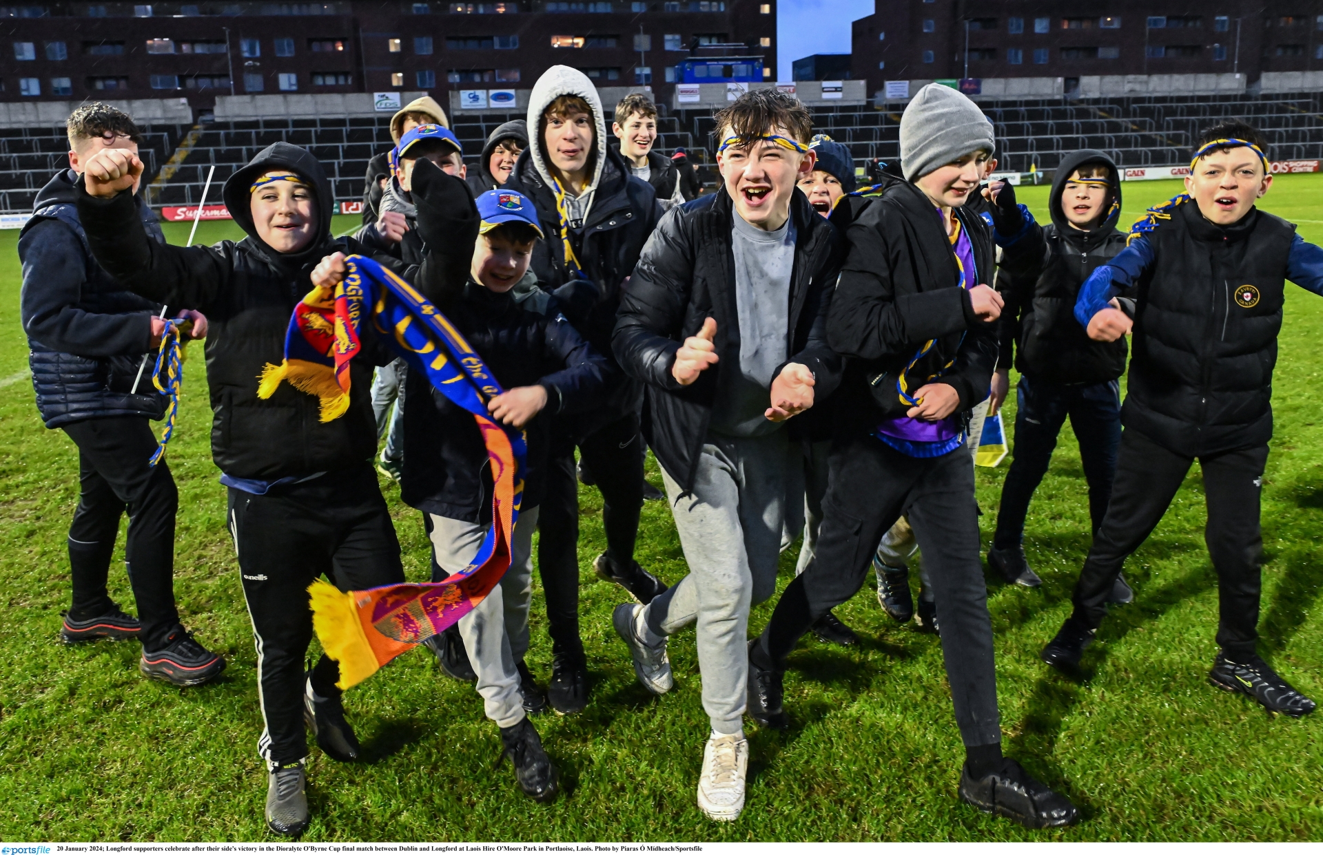 Caption: Longford supporters celebrate after their side's victory in the Dioralyte O'Byrne Cup final match between Dublin and Longford at Laois Hire O'Moore Park in Portlaoise, Laois. Photo by Piaras Ó Mídheach/Sportsfile