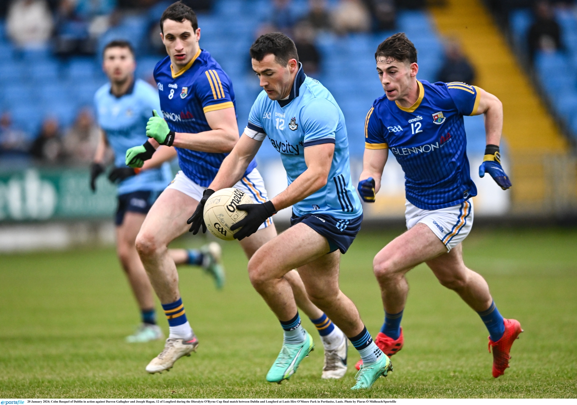 Caption: Colm Basquel of Dublin in action against Darren Gallagher and Joseph Hagan, 12 of Longford during the Dioralyte O'Byrne Cup final match between Dublin and Longford at Laois Hire O'Moore Park in Portlaoise, Laois. Photo by Piaras Ó Mídheach/Sportsfile
