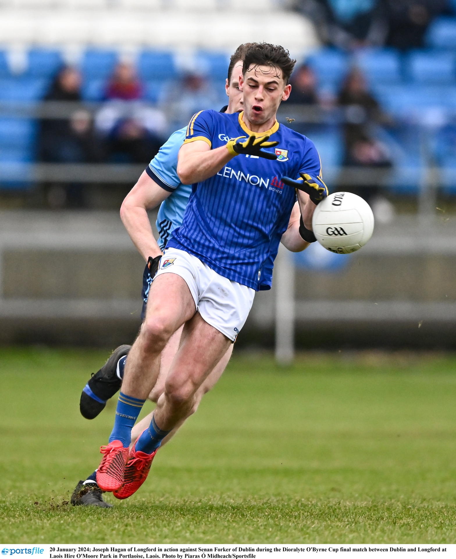 Caption: Joseph Hagan of Longford in action against Senan Forker of Dublin during the Dioralyte O'Byrne Cup final match between Dublin and Longford at Laois Hire O'Moore Park in Portlaoise, Laois. Photo by Piaras Ó Mídheach/Sportsfile