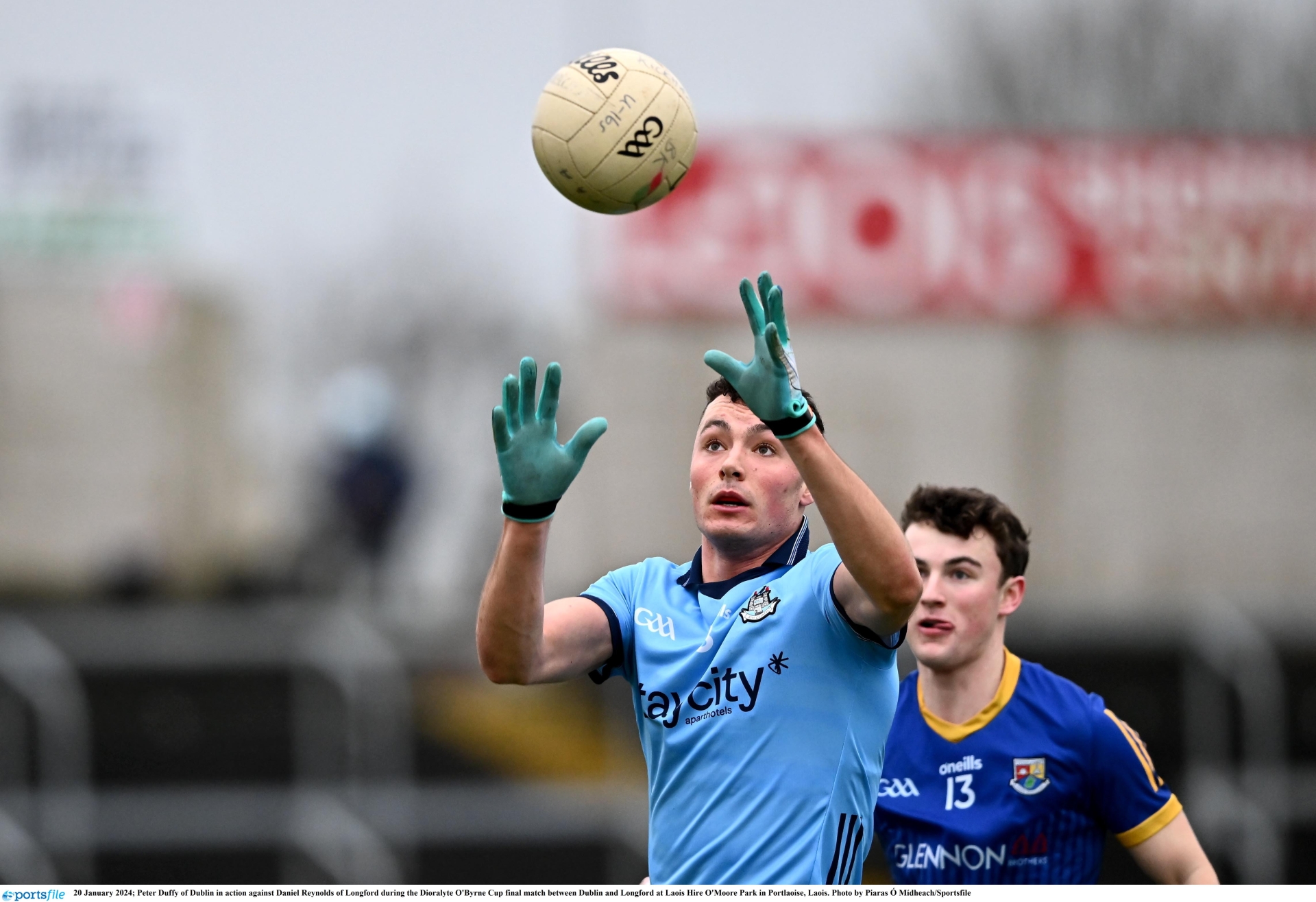 Caption: Peter Duffy of Dublin in action against Daniel Reynolds of Longford during the Dioralyte O'Byrne Cup final match between Dublin and Longford at Laois Hire O'Moore Park in Portlaoise, Laois. Photo by Piaras Ó Mídheach/Sportsfile