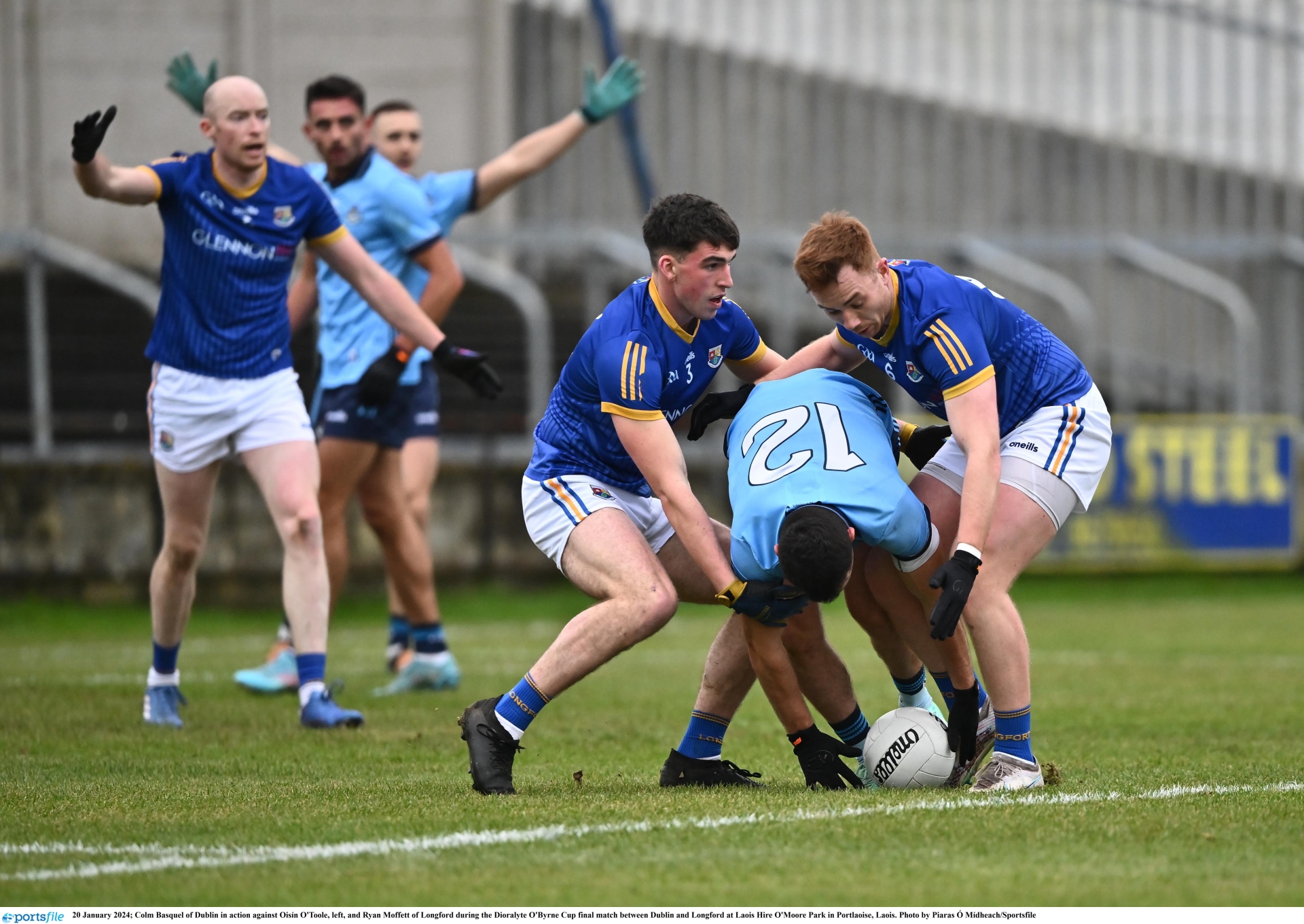 Caption: Colm Basquel of Dublin in action against Oisín O'Toole, left, and Ryan Moffett of Longford during the Dioralyte O'Byrne Cup final match between Dublin and Longford at Laois Hire O'Moore Park in Portlaoise, Laois. Photo by Piaras Ó Mídheach/Sportsfile
