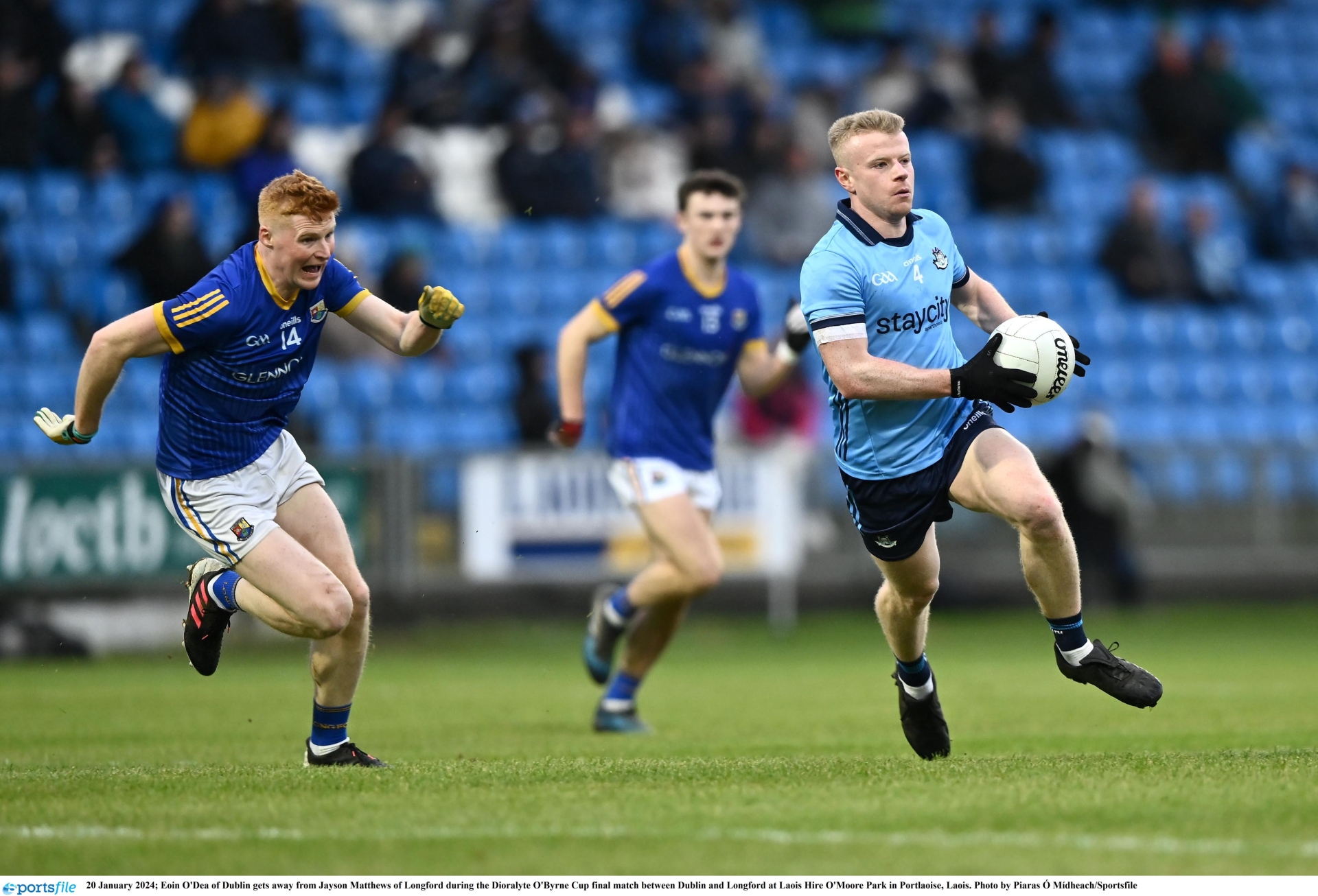 Caption: Eoin O'Dea of Dublin gets away from Jayson Matthews of Longford during the Dioralyte O'Byrne Cup final match between Dublin and Longford at Laois Hire O'Moore Park in Portlaoise, Laois. Photo by Piaras Ó Mídheach/Sportsfile