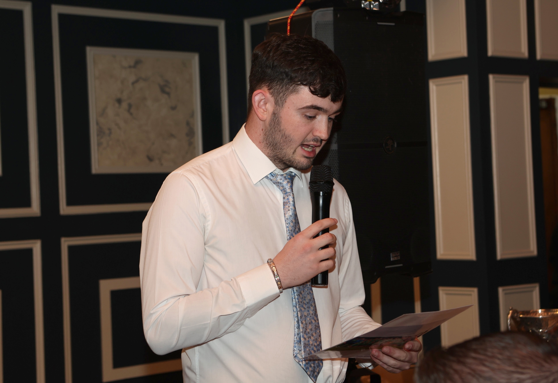 Caption: St Brigid's Gaels Ardagh Moydow social night. Shane Quinn delivers a heartwarming address to the St Brigid's club from his mother, Club President Theresa Quinn McDermott. Theresa expressed her love for everything associated with the club. Photo: Syl Healy