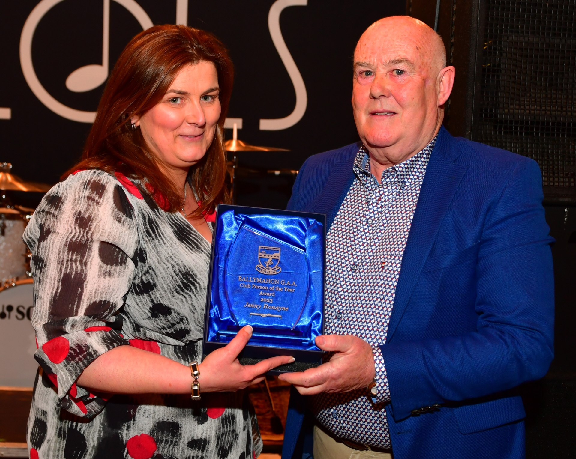 Caption: Jenny Ronayne receiving the club person of the year award from Christy Mannion at last weekend's Ballymahon Gaa and LGFA Dinner Dance in the Rustic Inn