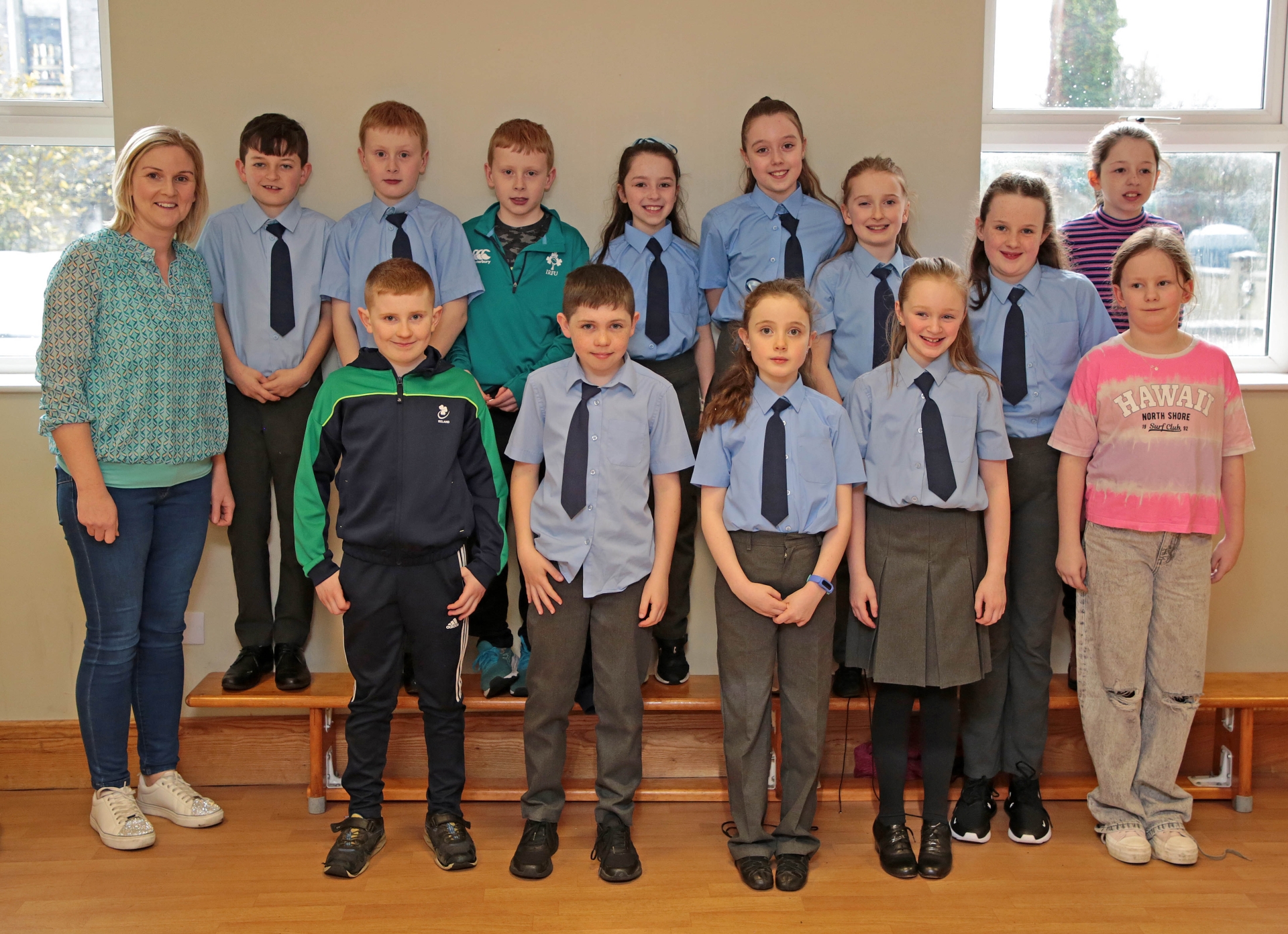 Caption: Bunlahy NS with Anita Brady at the Longford School Scór in Abbeylara Parish Centre