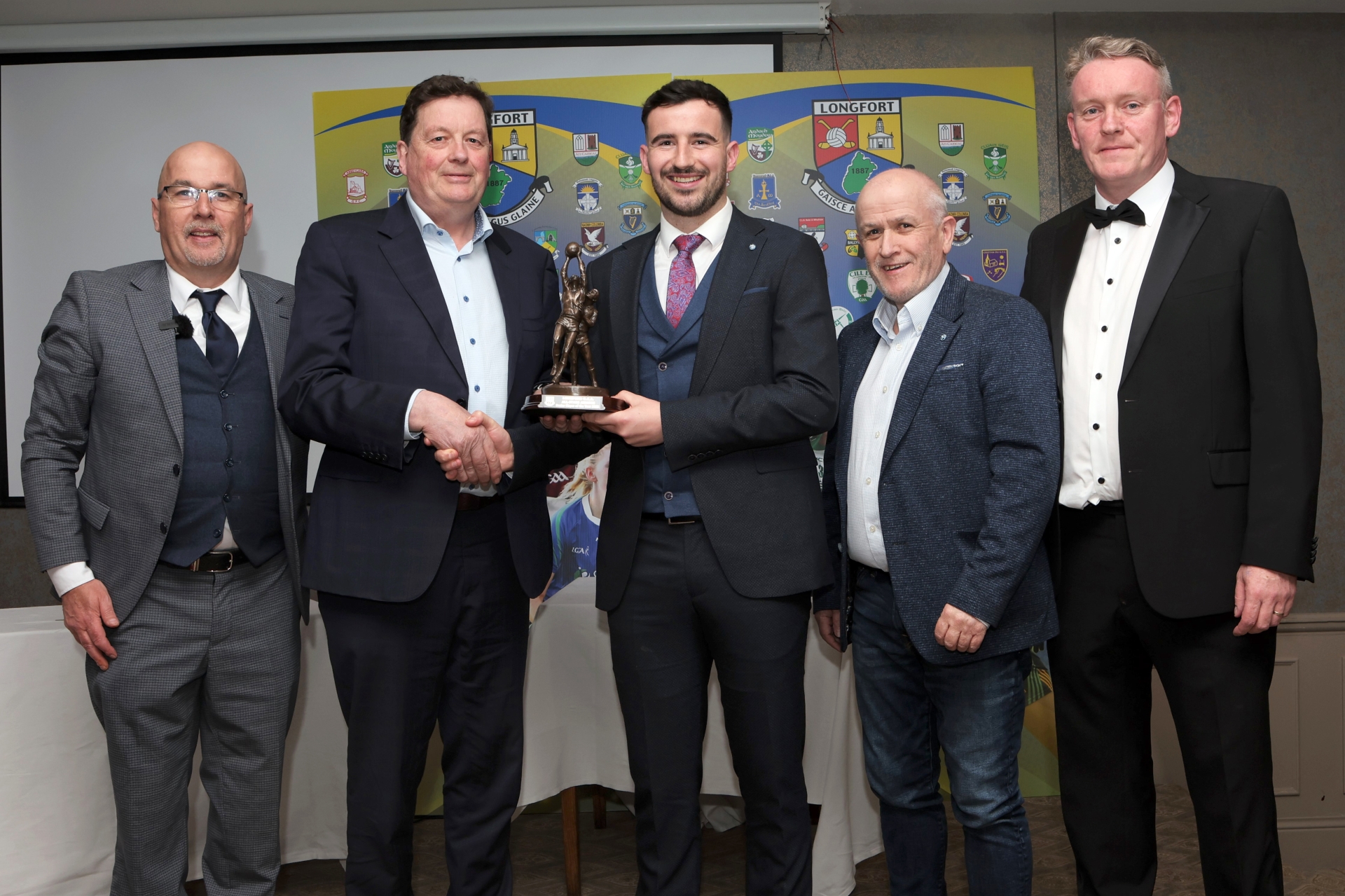 Caption: Killoe and Longford footballer Mark Hughes (centre) receives the 2023 Senior Football Championship Player of the Year Award from Longford GAA Chairperson Albert Cooney with MC Benny O'Brien, Longford Leader Sports Editor Padraic O'Brien and Senator Micheal Carrigy also in the picture