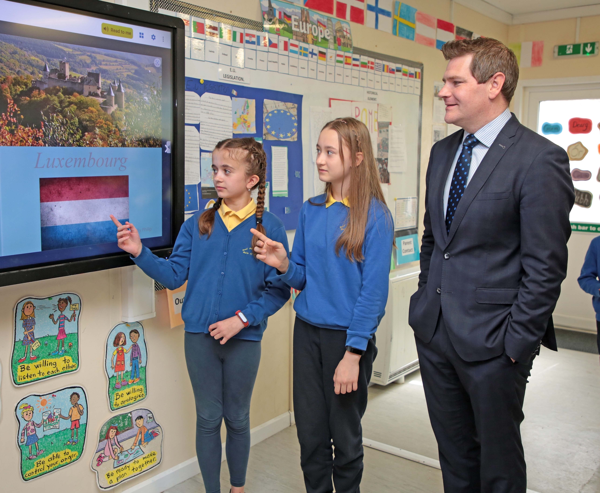 Caption: Minister for Enterprise, Trade and Employment Peter Burke with Yana Kogurt and Danika Voitanik Picture: Shelley Corcoran