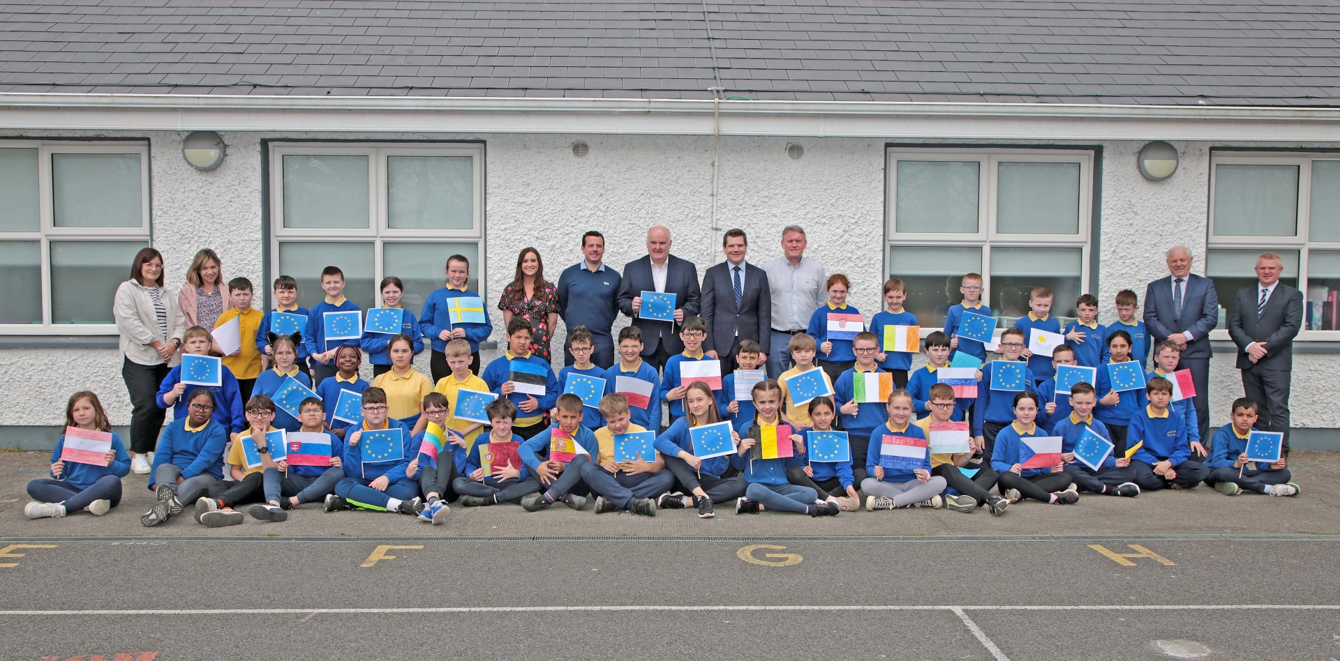 Caption: Minister for Enterprise, Trade and Employment Peter Burke with the pupils of St Matthew's National School, Ballymahon as they showcased their knowledge of European matters Picture: Shelley Corcoran