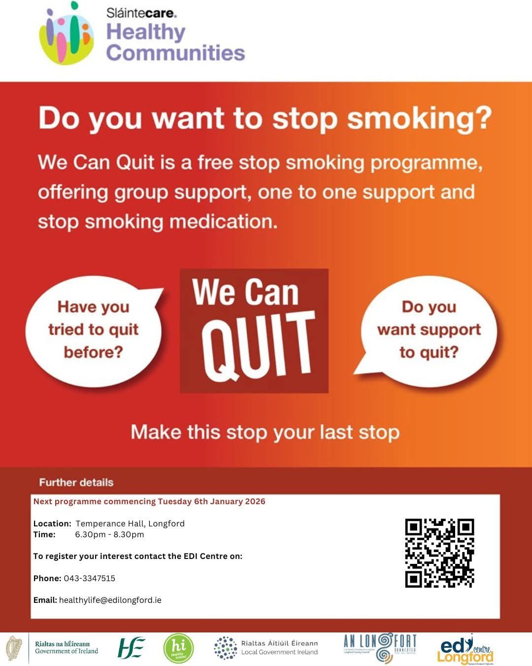Longford County Council have announced details of an upcoming We Can Quit programme - a free stop smoking course which offers one-to-one support and free stop smoking medication so you're on the best path to quitting for good.